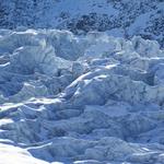wir verlassen links abbiegend das Ende der Moräne und erreichen die unmittelbar vor dem Gletscherchaos des Vadret da Tschierva. Datum 28.03.2018