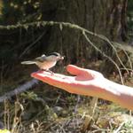 wir können Meisen, Rotkelchen und vor allem Haubenmeisen beobachten, die uns sogar aus der Hand fressen Datum 25.03.2018