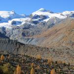 unser Blick schweift über die riesige Seitenmoräne des Vadret da Tschierva zum Il Chapütschin, La Muongia und Piz Glüschaint