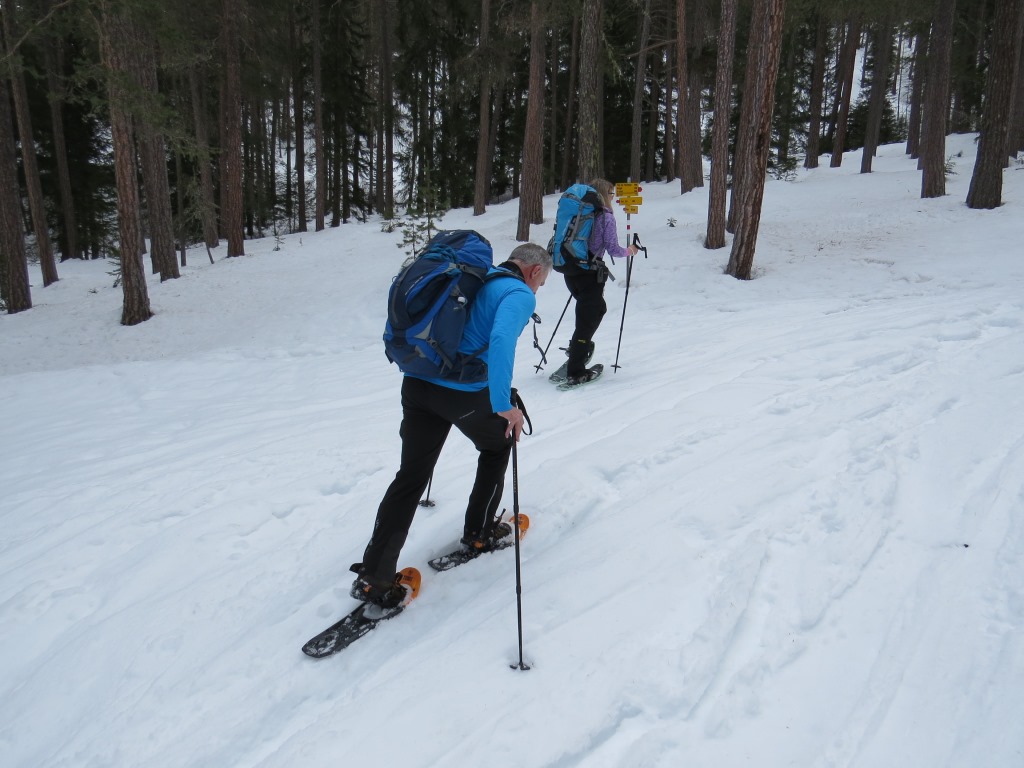 ...und laufen mit den Schneeschuhen über Plan San Jon hinunter zu Punkt 1375 m.ü.M.
