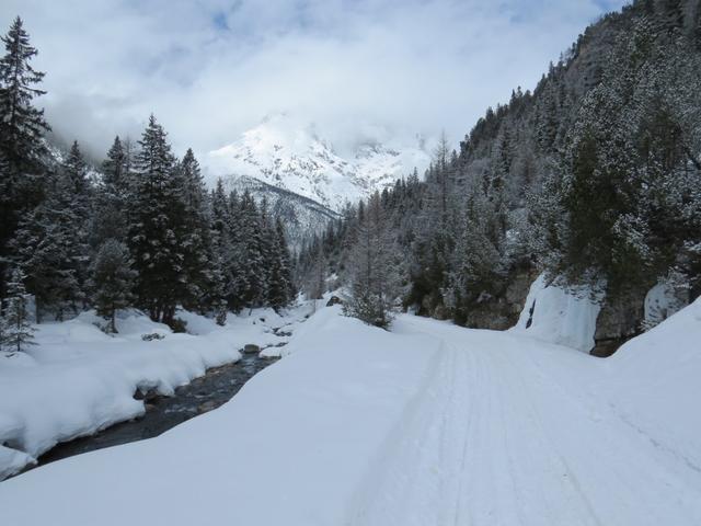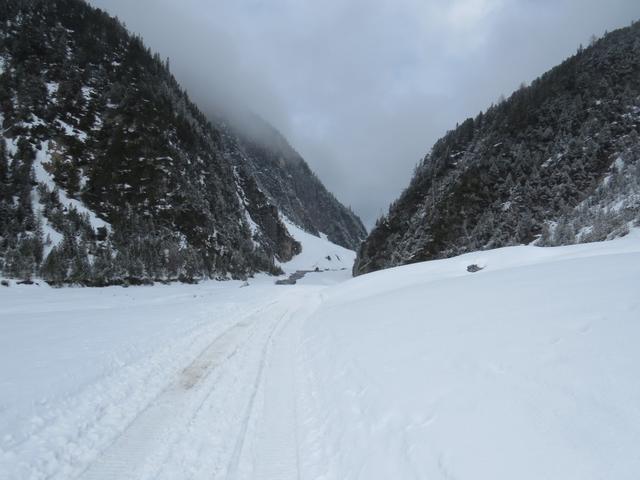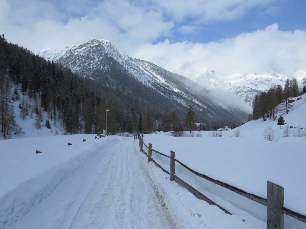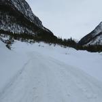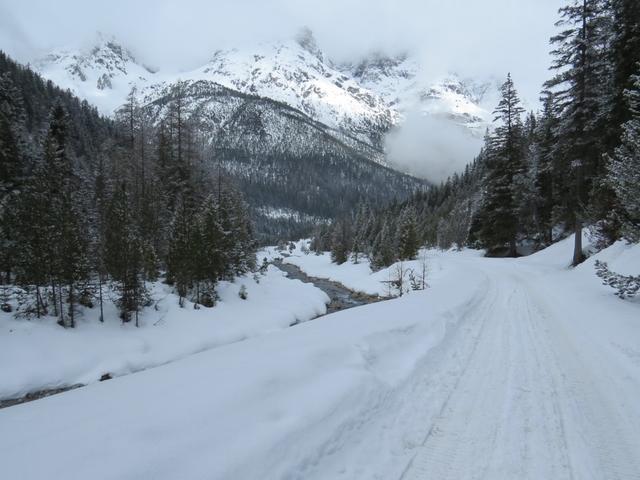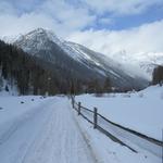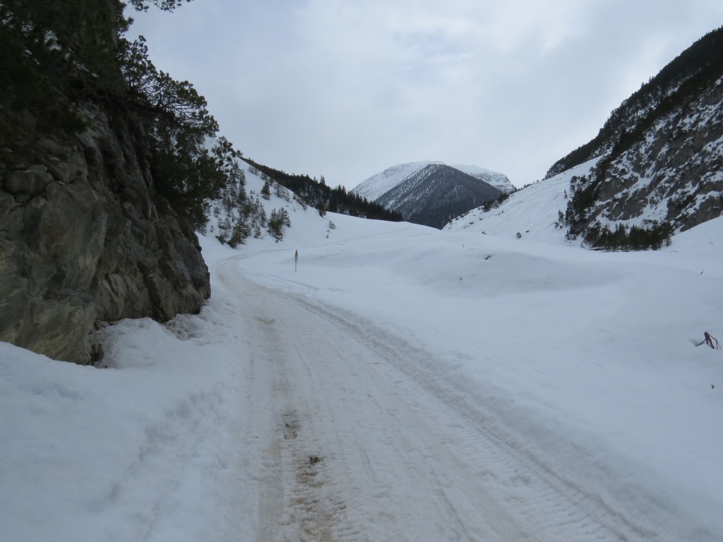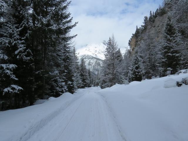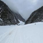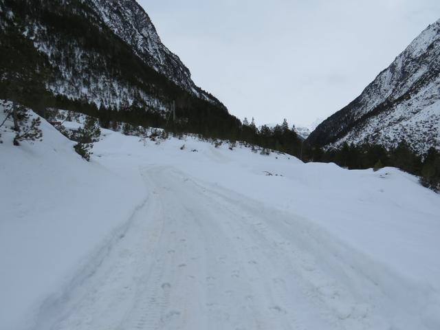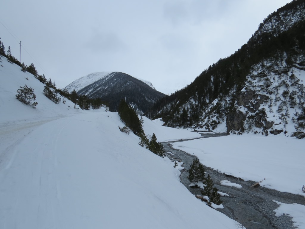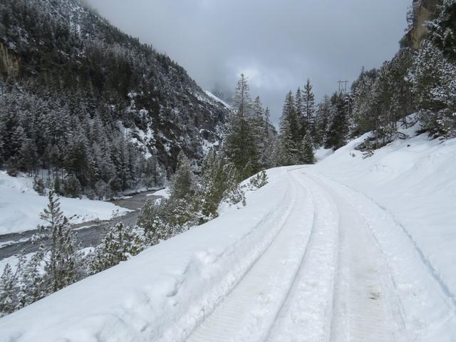 ab jetzt führt unsere Schneeschuhwanderung alles der Strasse entlang hinein ins Val S-charl