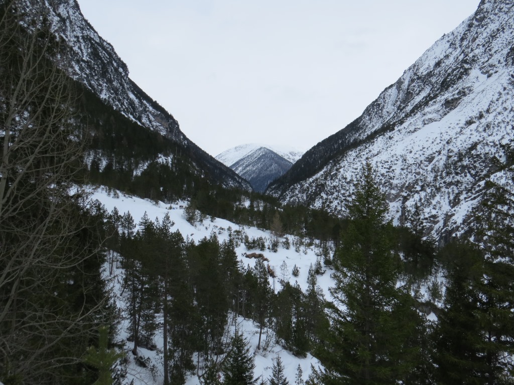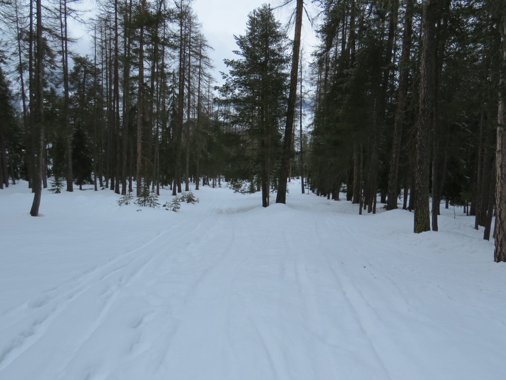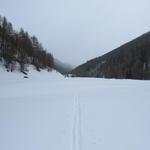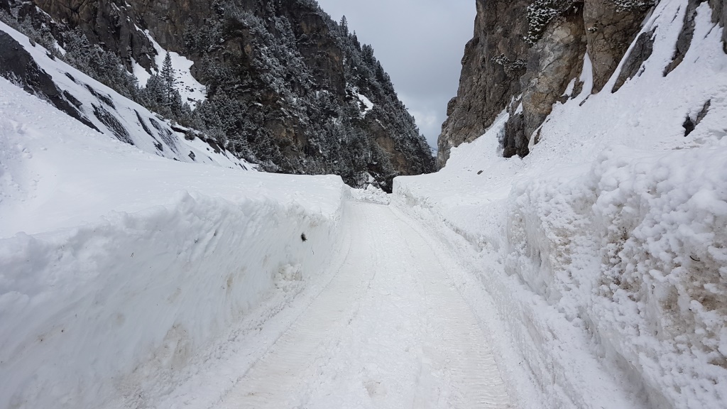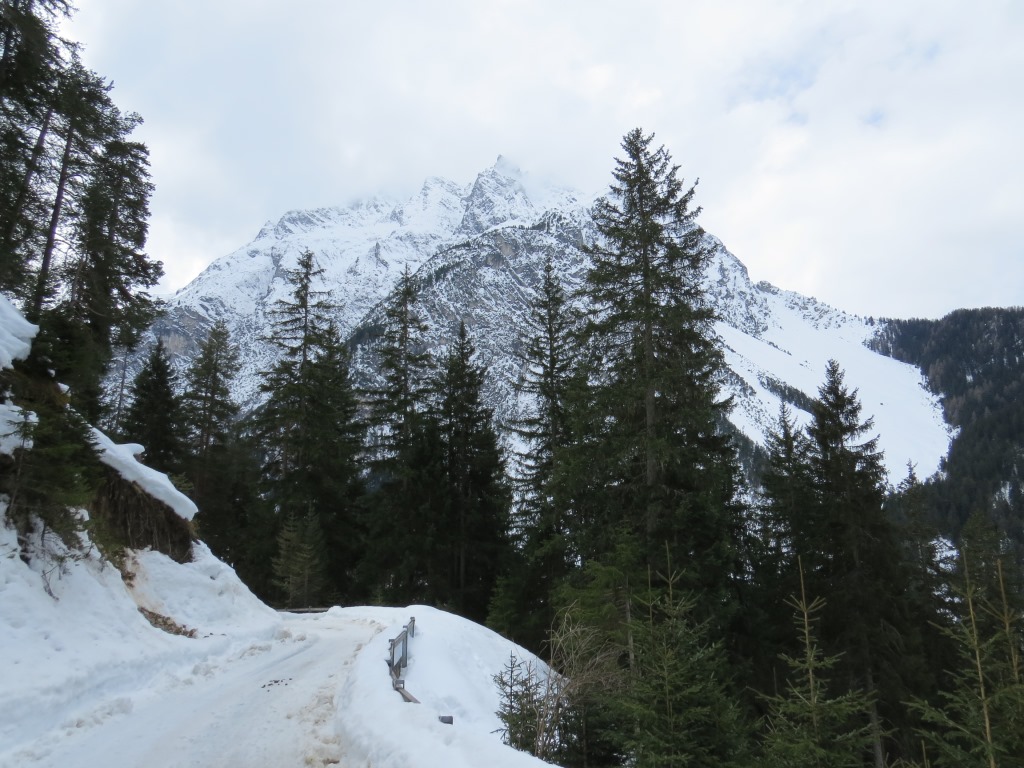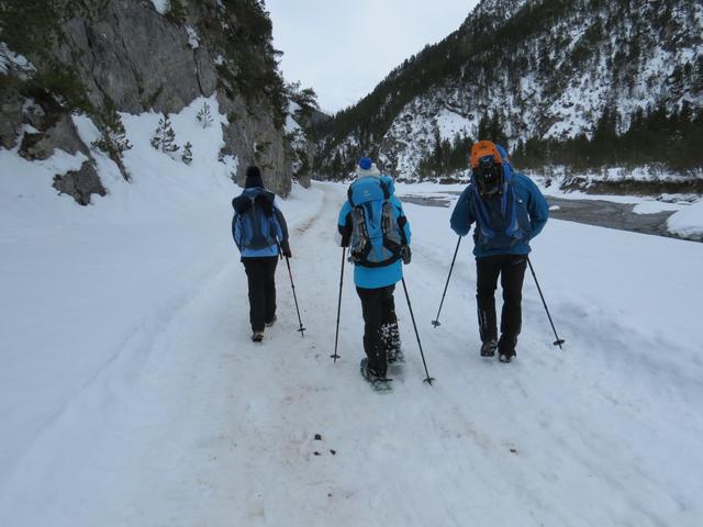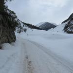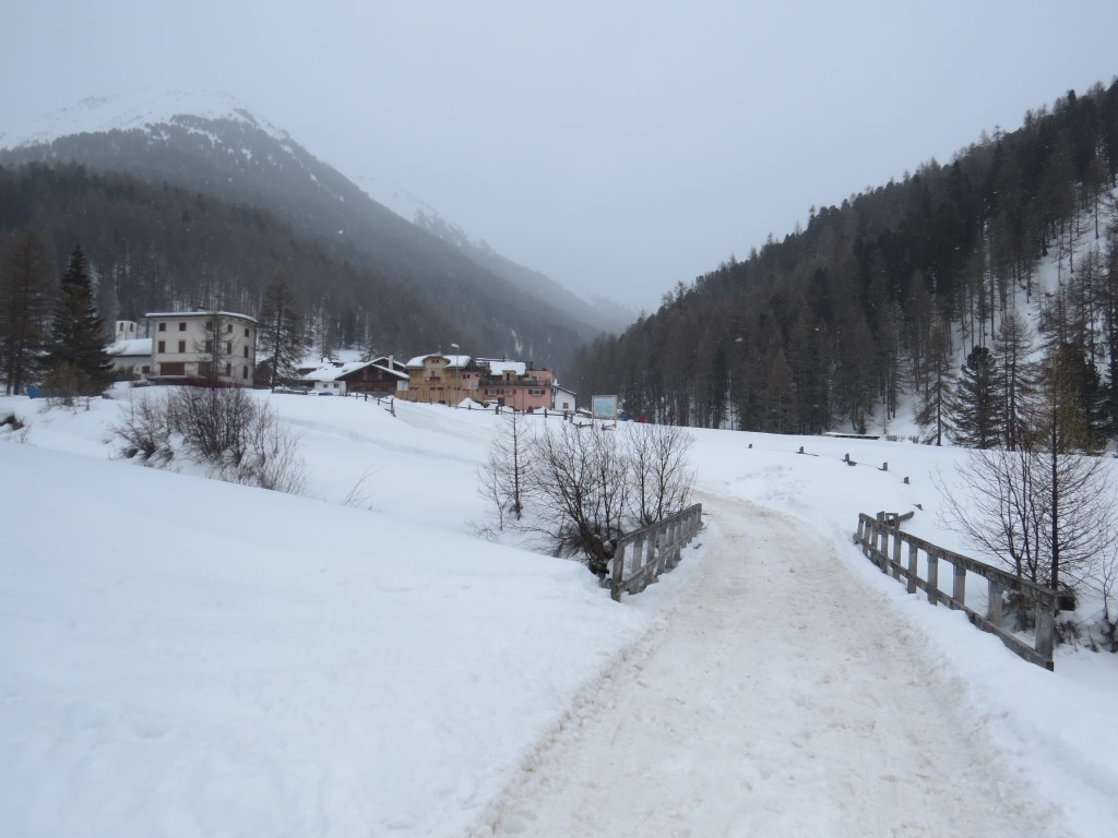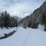ab jetzt führt unsere Schneeschuhwanderung alles der Strasse entlang hinein ins Val S-charl
