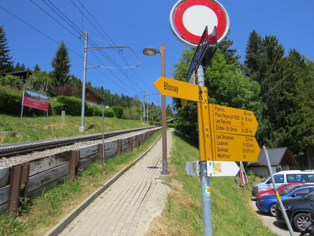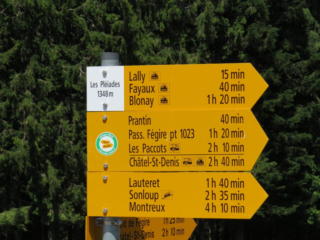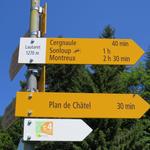 Wegweiser bei Les Avants 970 m.ü.M. Unsere heutige Wanderung wird uns hinauf nach Les Pléjades führen