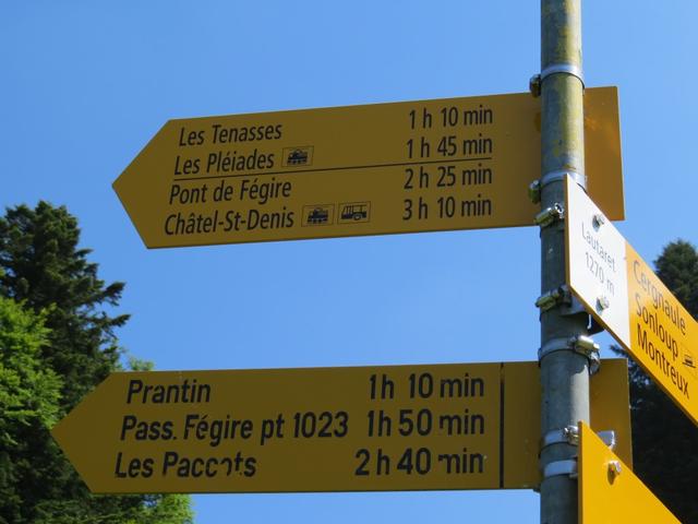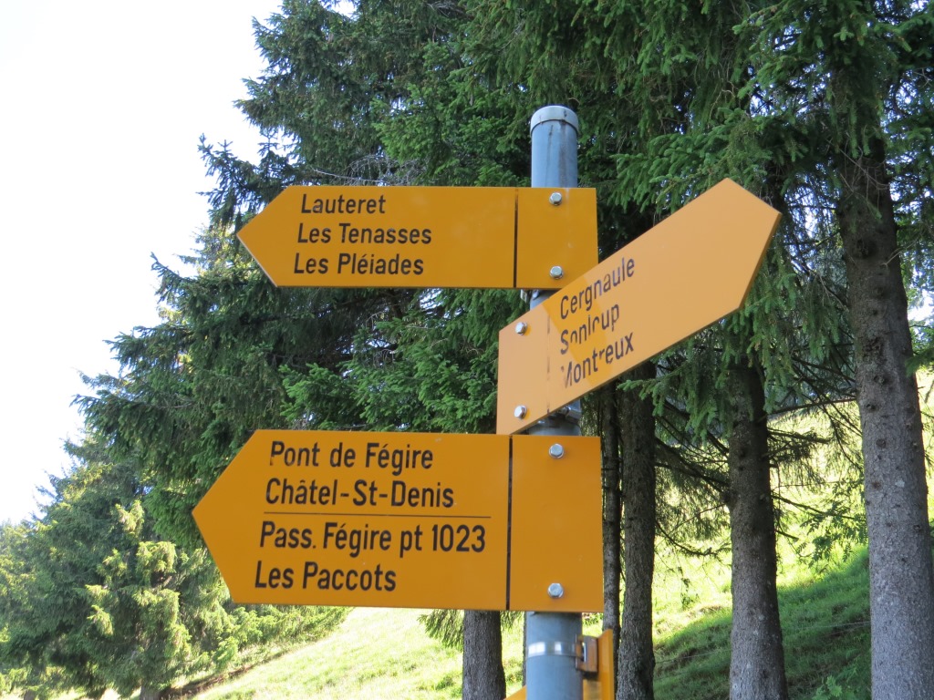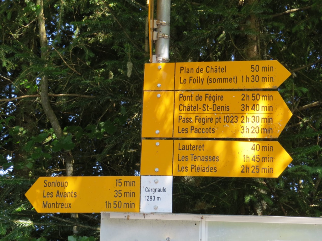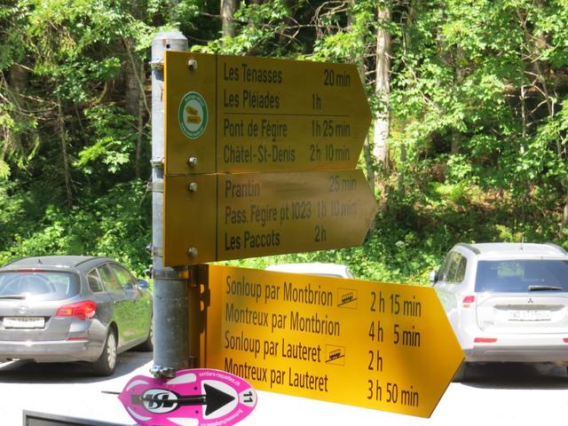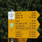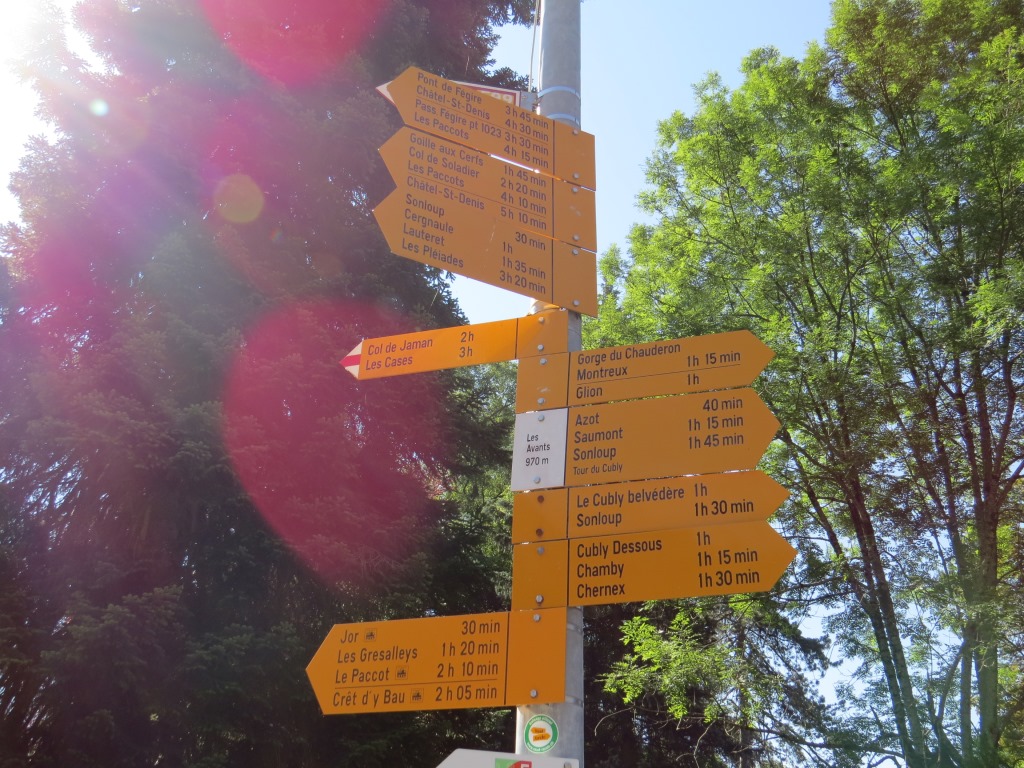 Wegweiser bei Les Avants 970 m.ü.M. Unsere heutige Wanderung wird uns hinauf nach Les Pléjades führen