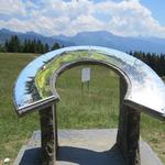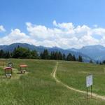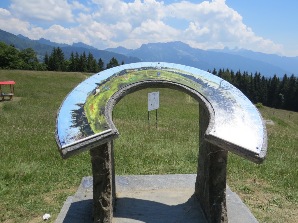 noch ein paar Schritte und wir stehen beim Kreuz und beim Panoramanzeiger auf der Gipfelwiese der Les Pléiades 1362 m.ü.M.