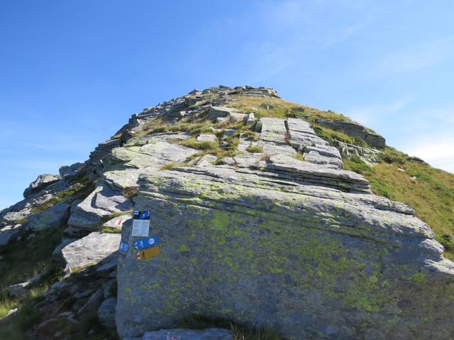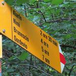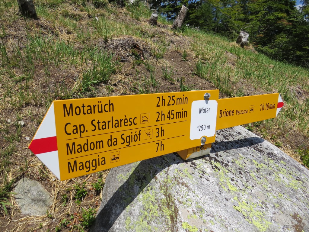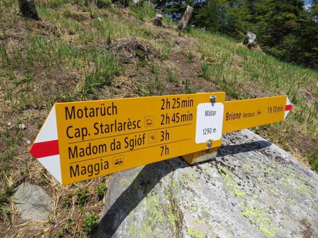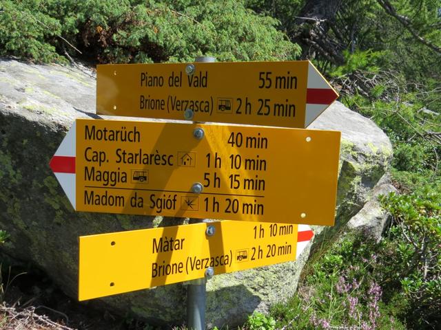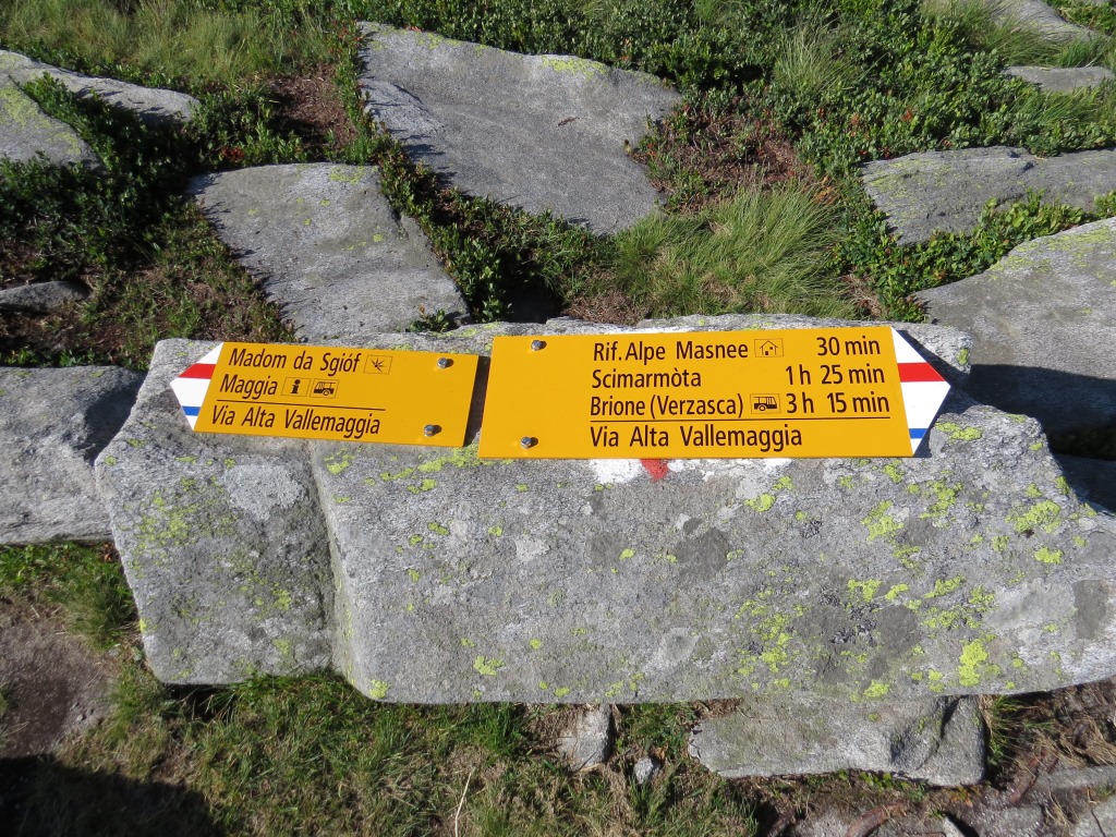 Wegweiser auf dem Madom da Sgióf. Unser Tagesziel lautet nun Brione