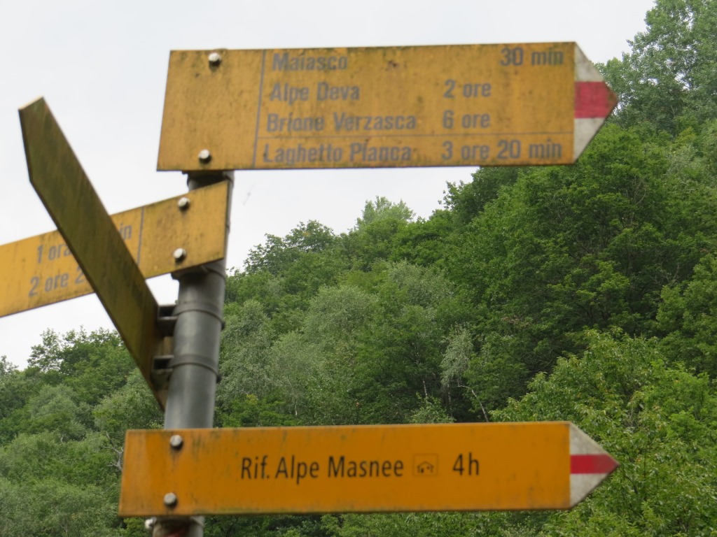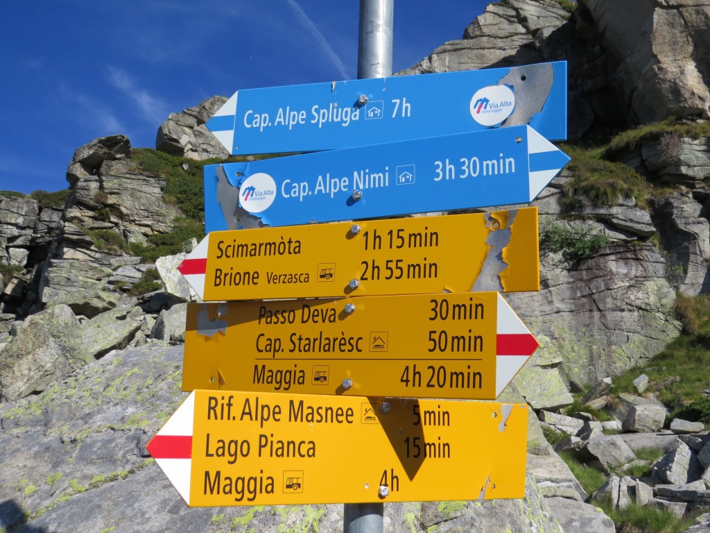 Wegweiser bei dem Rifugio Alpe Masnee. Unser erstes Ziel ist der Passo Deva
