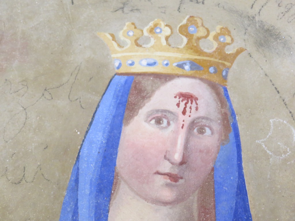 bei vielen Bildstöcken -wie auch hier wieder- ist Maria mit einer Wunde an der Stirn ersichtlich