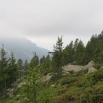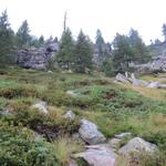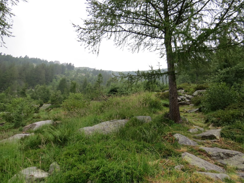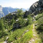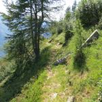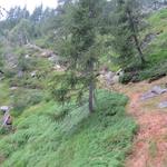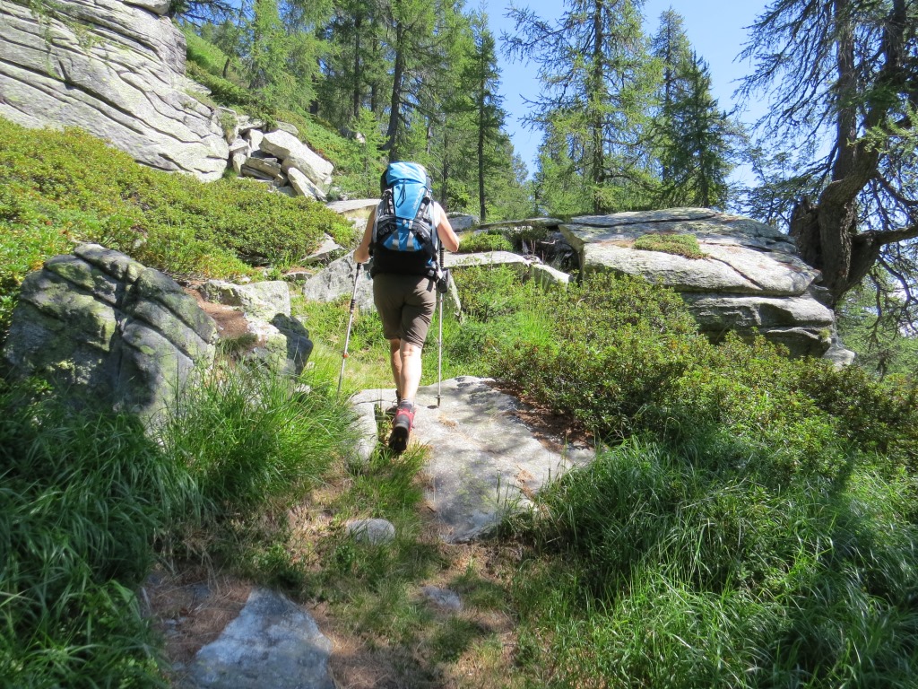 über einen ruppigen Weg zwischen Felsblöcken, Lärchenbäumen und Grashänge geht es nun steil aufwärts