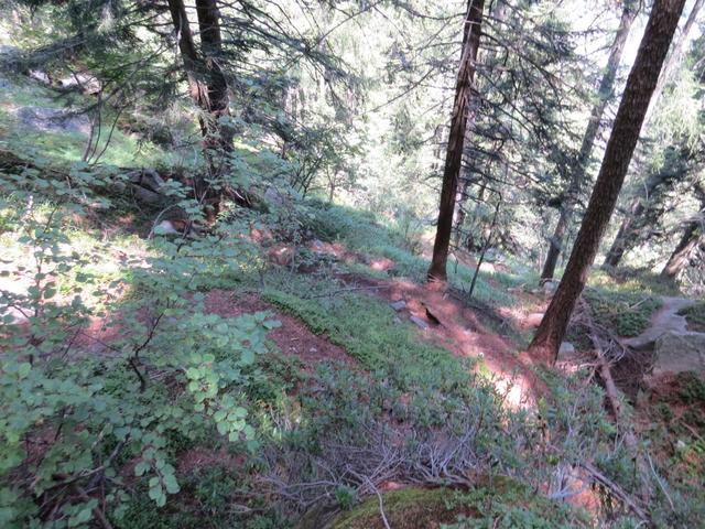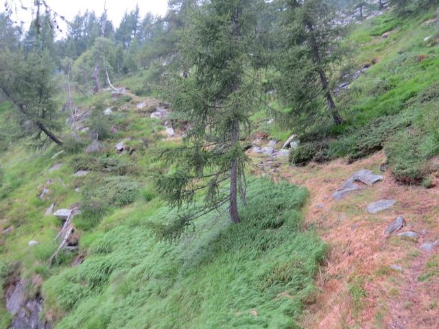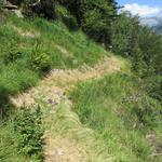 über einen herausgemähtem Weg mit einigen Gegensteigungen, durchlaufen wir nun einen sehr schönen Lärchenwald