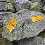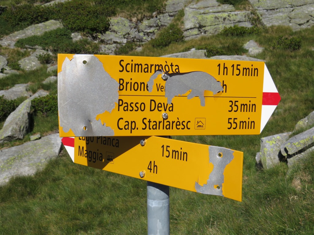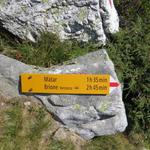 Wegweiser bei der Weggabelung 1976 m.ü.M. Unser Tagesziel lautet weiterhin Brione. 1200hm fehlen noch