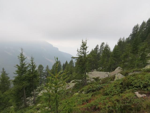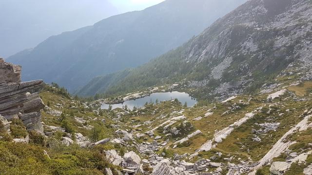 tief unter uns der Laghetto di Pianca, von wo wir gekommen wären, wenn es nicht geregnet hätte