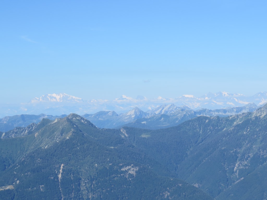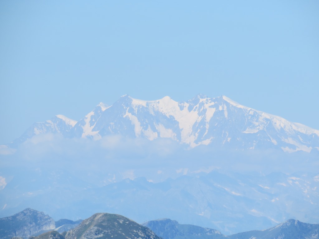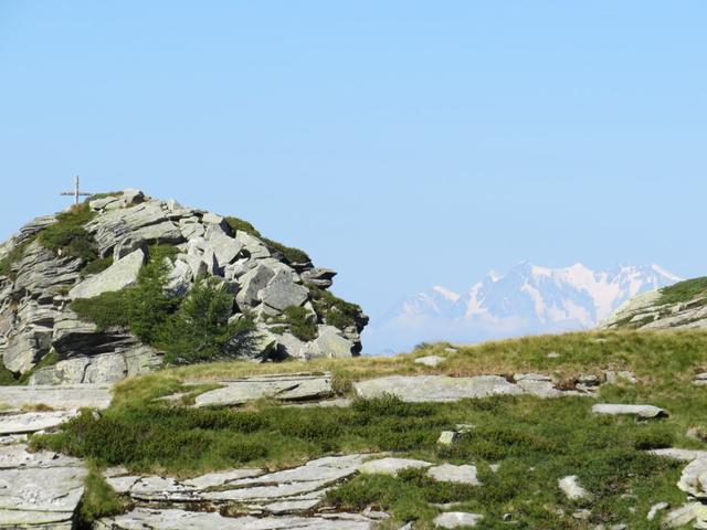 wir blicken zurück zum Aussichtspunkt mit Kreuz. Dahinter taucht das Massiv des Monte Rosa auf!