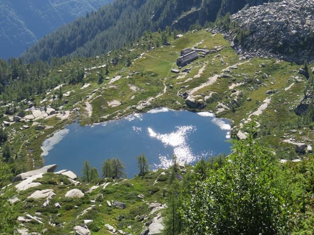 150 Meter unter uns der liebliche Lago del Starlaresc mit der gleichnamigen Capanna