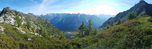 sehr schönes Breitbildfoto. Links Cima del Masnee, in der Bildmitte der Lago del Starlaresc, recht der Madom da Sgióf