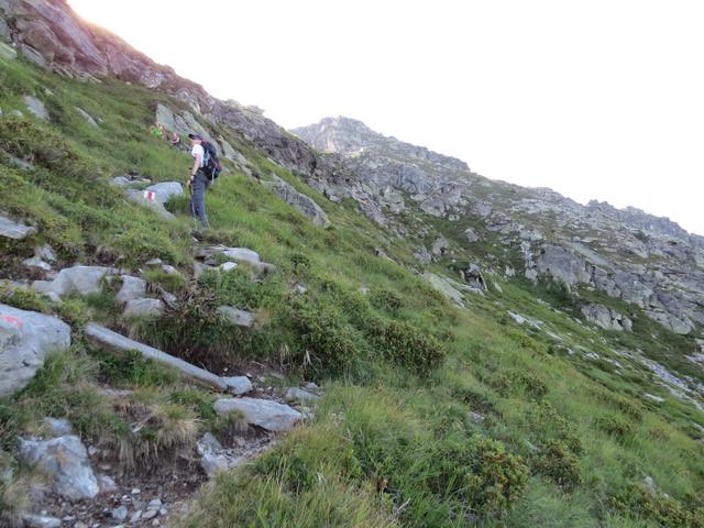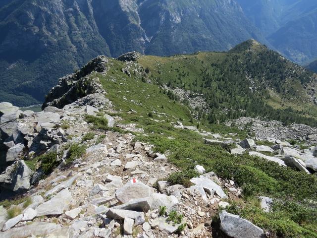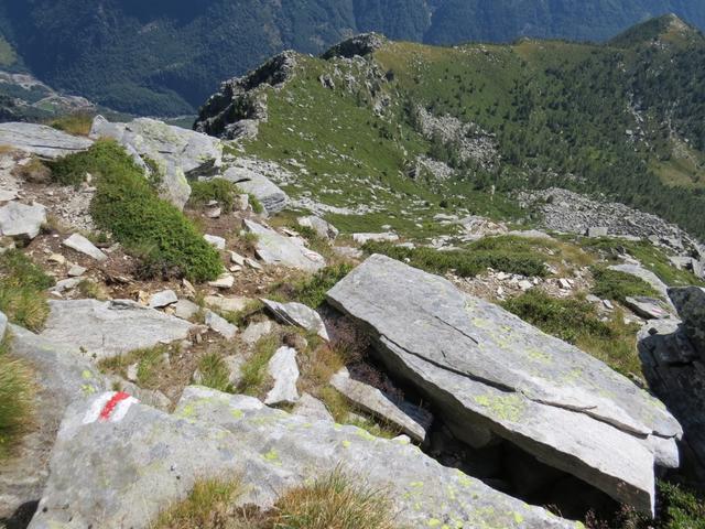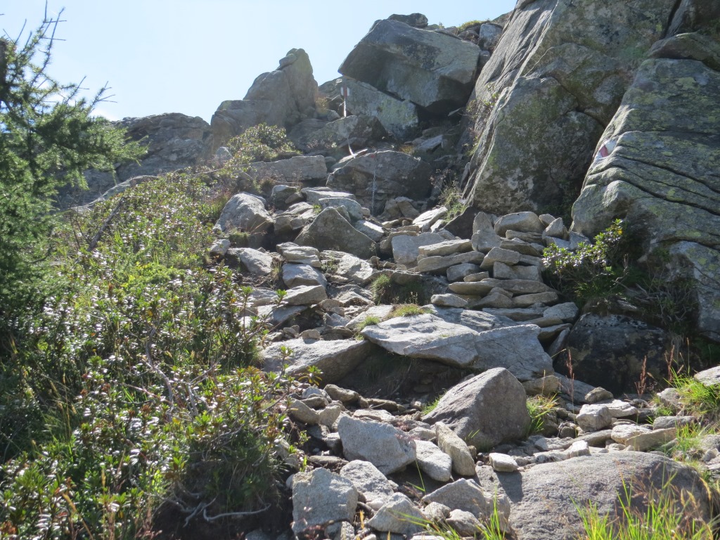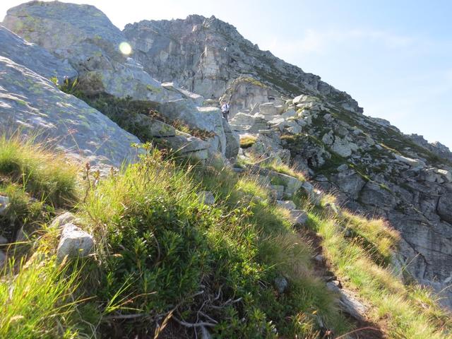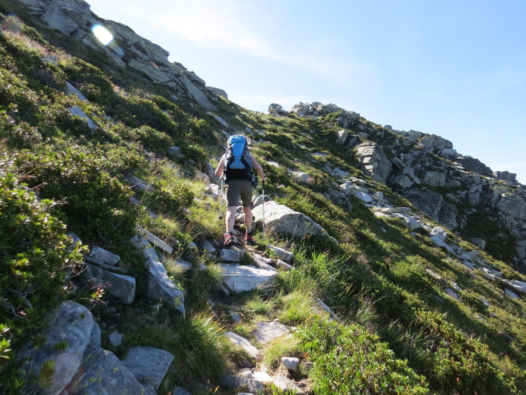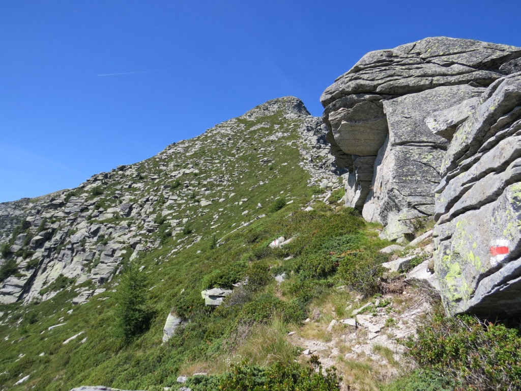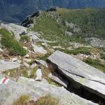 über den Nordostgrat steigen wir auf einem weiterhin weiss-rot-weiss markierten, sehr gut ausgebauter Bergpfad steil ab
