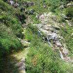 wir durchqueren die wilde Flanke des Motarüch und des Lago di Starlaresc. Bachrunsen müssen überquert werden
