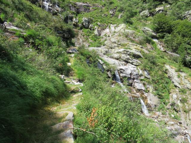 die vom Lago Starlaresc hinunterziehenden Gebirgsbäche können bei Hochwasser heikel sein. Darum sind sie mit Seilen gesichert