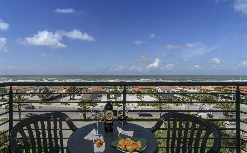 die traumhafte Aussicht vom Balkon auf das Meer