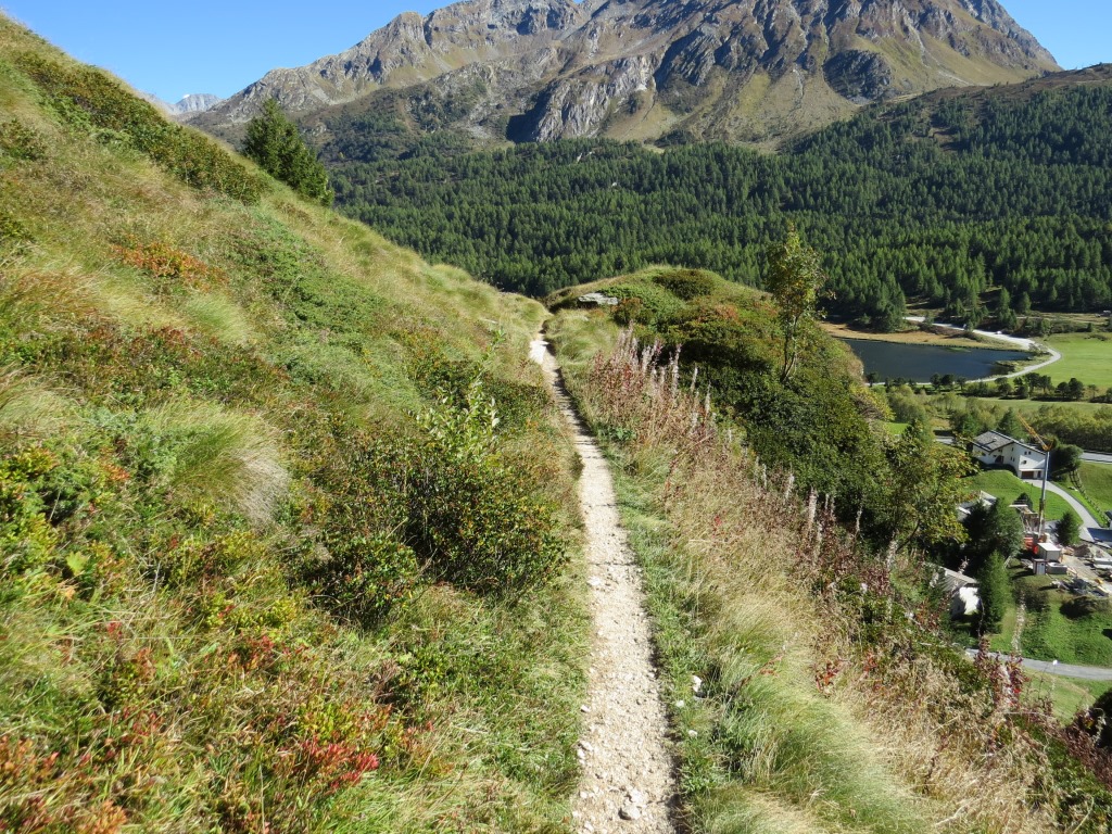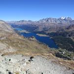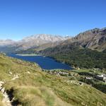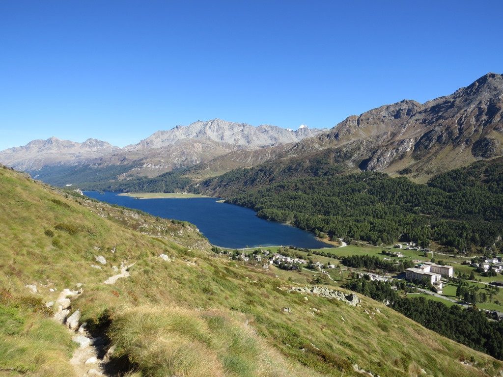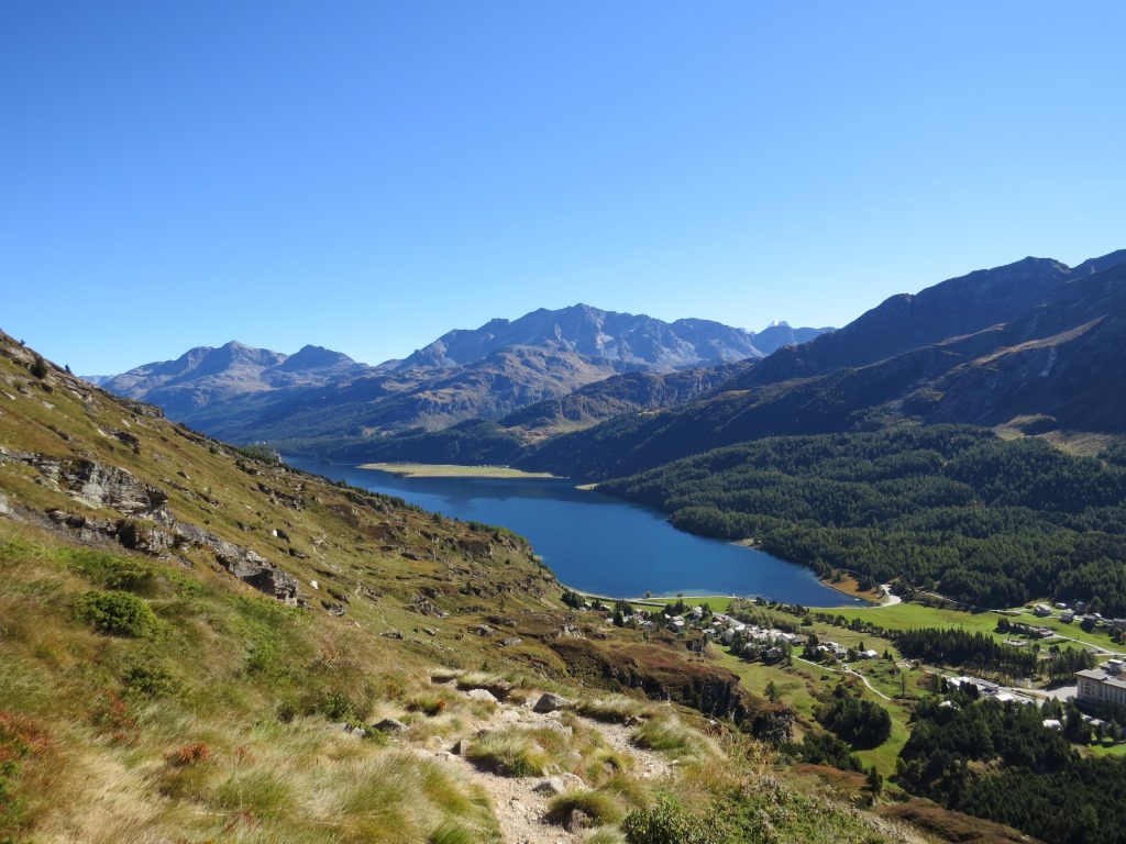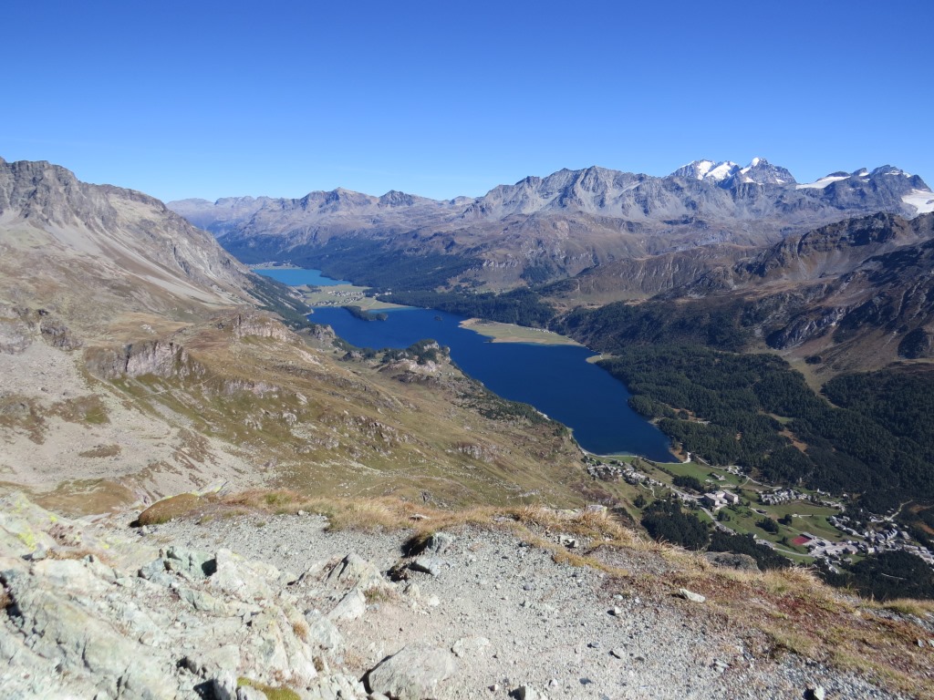 während dem ganzen Abstieg begleitet uns nun eine grandiose Aussicht auf die Oberengadiner Seenplatte und die umliegenden Berge