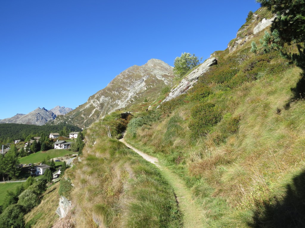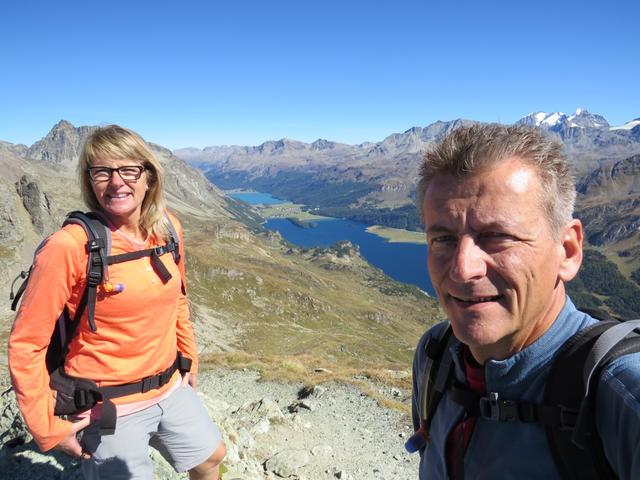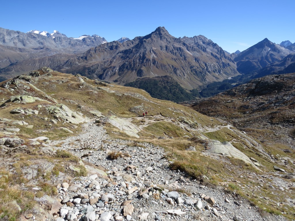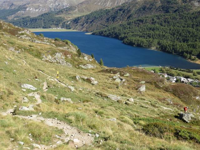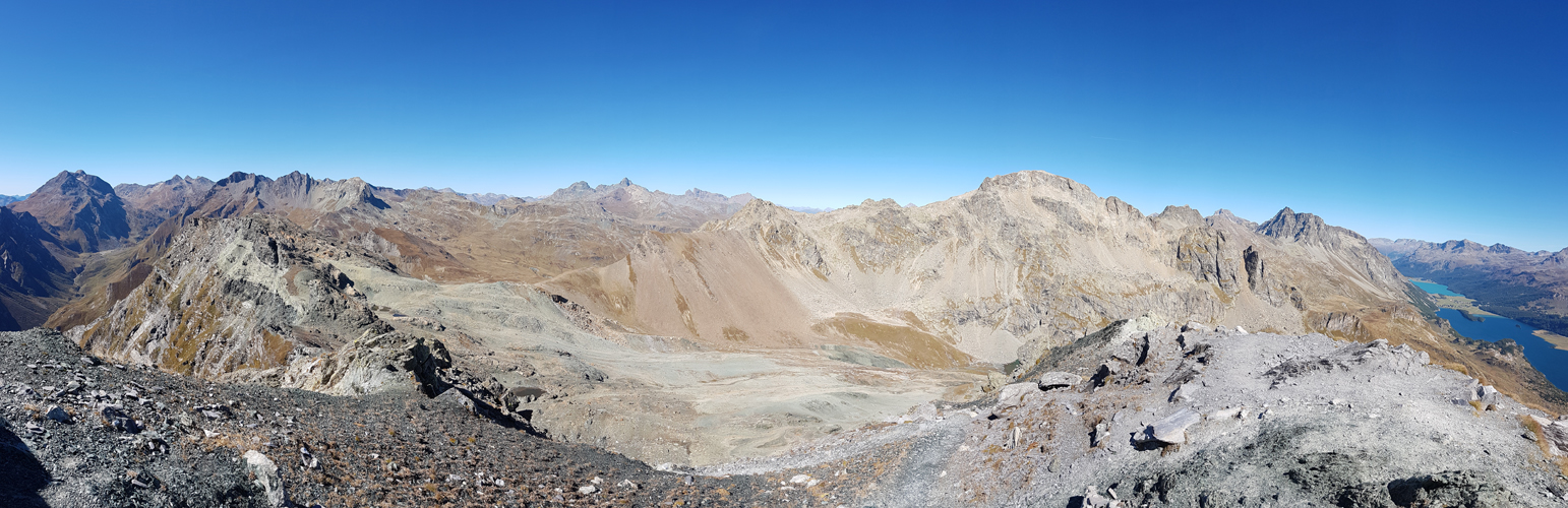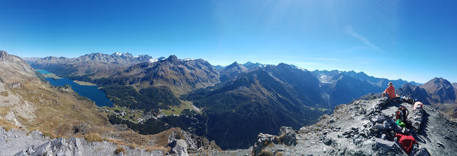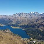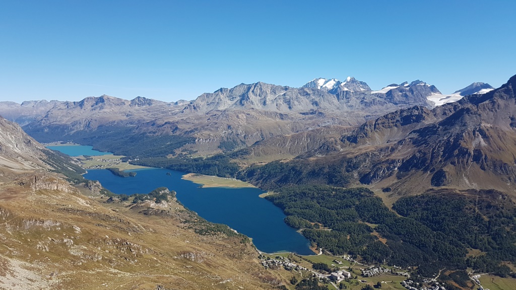 während dem ganzen Abstieg begleitet uns nun eine grandiose Aussicht auf die Oberengadiner Seenplatte und die umliegenden Berge