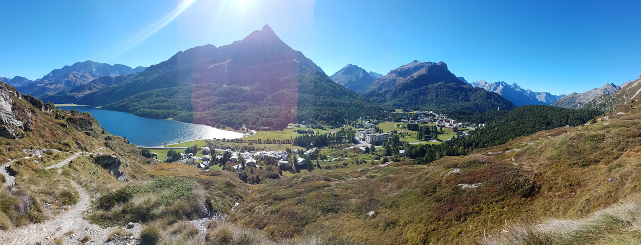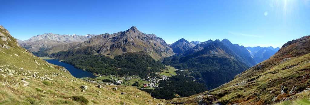 schönes Breitbildfoto. Blick auf Maloja und Silsersee. Bei Breitbildfotos nach dem anklicken, immer noch auf Vollgrösse klicke
