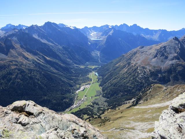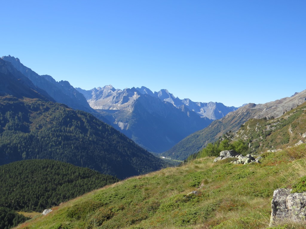 Blick ins Val Bregaglia. Sofort kommt uns die Wanderung auf dem Sentiero Panoramico nach Soglio in den Sinn