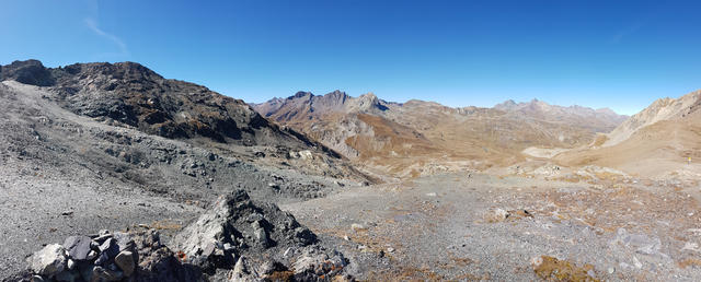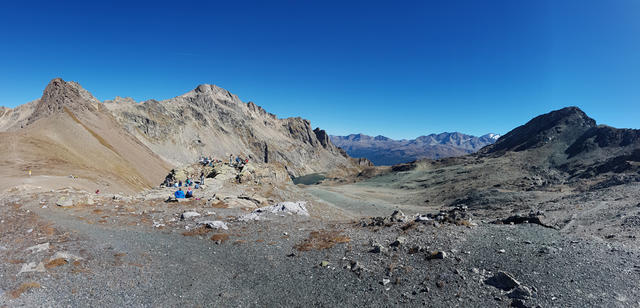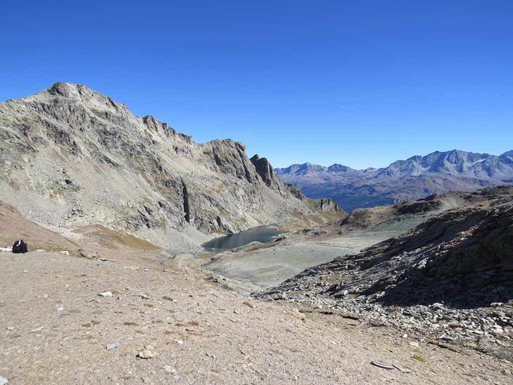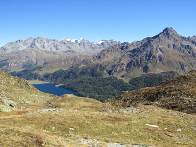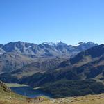 Blick von wo wir gekommen sind. Links Piz Grevasalvas, Bildmitte der Lunghinsee und rechts der Piz Lunghin