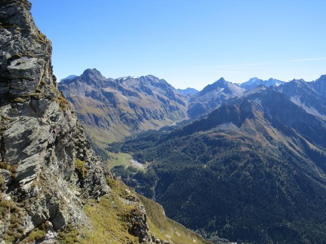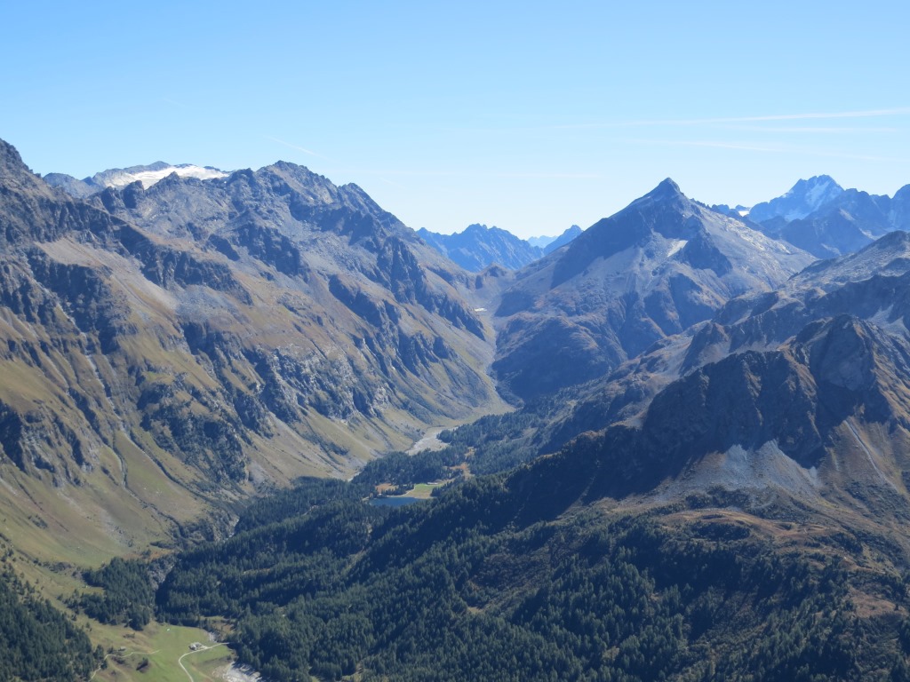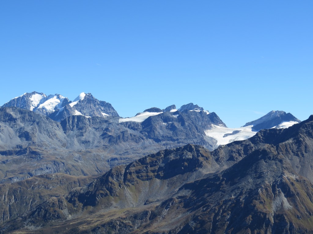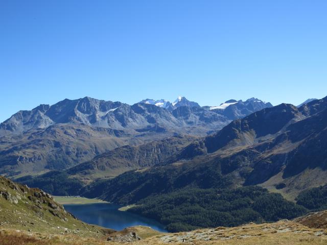 die Aussicht wird mit zunehmender Höhe grandioser. Am Horizont tauchen die Eisriesen z.B. der Piz Roseg auf