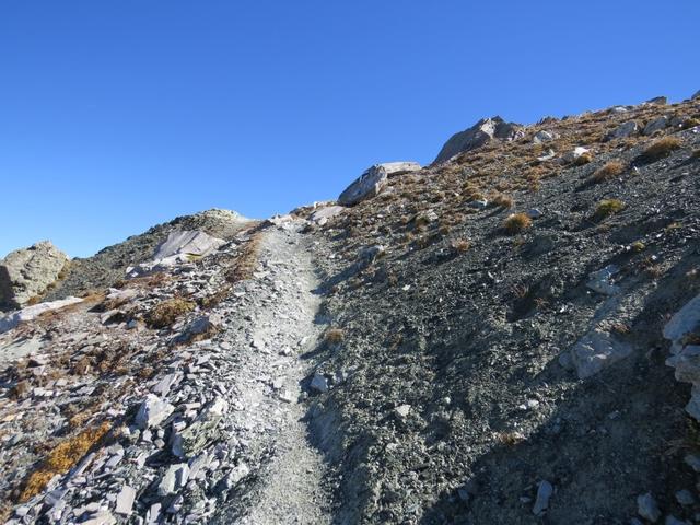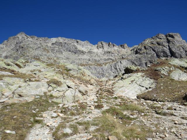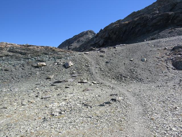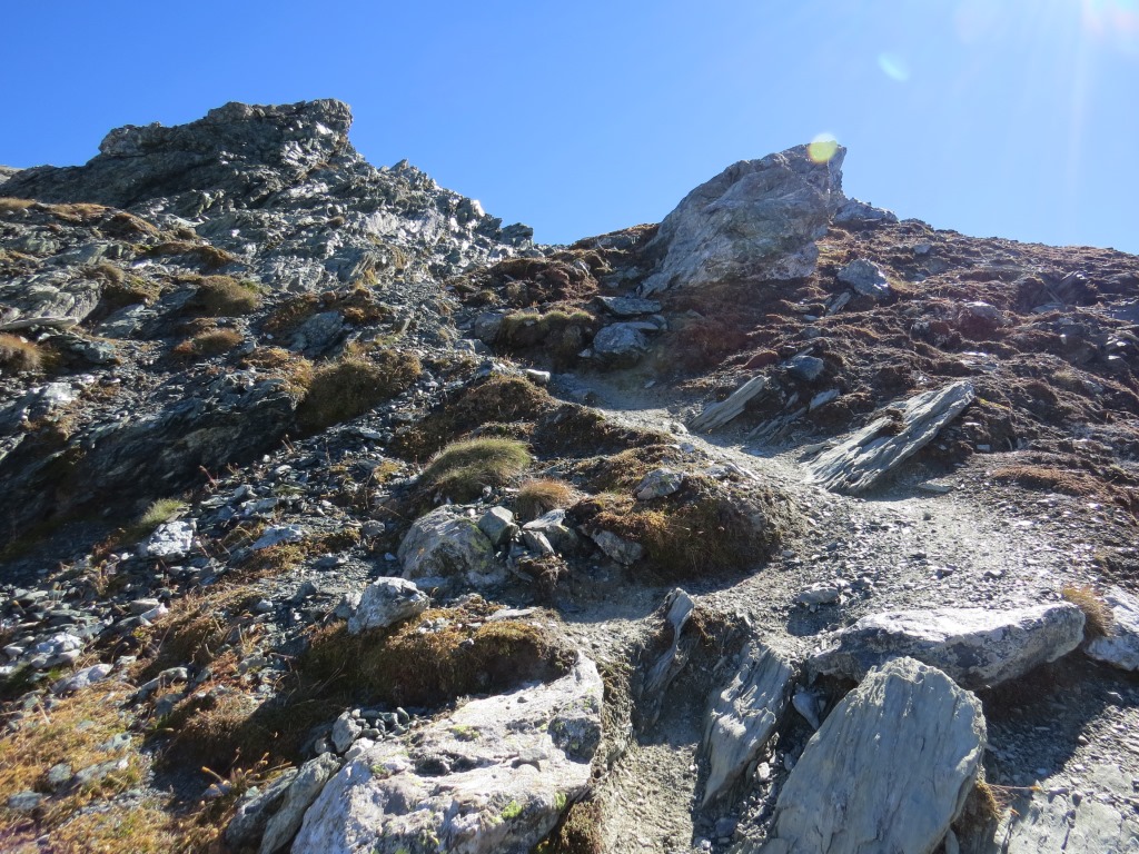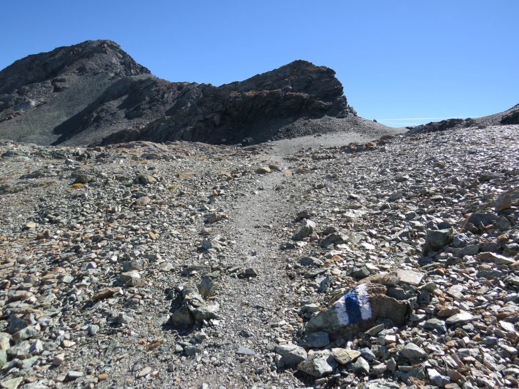 vom Pass folgen wir den weiss-blau-weiss markierten Aufstiegsspuren