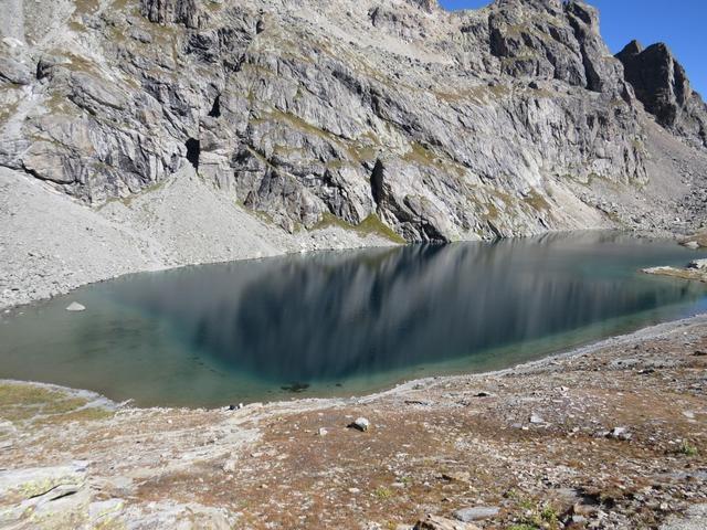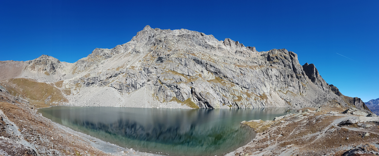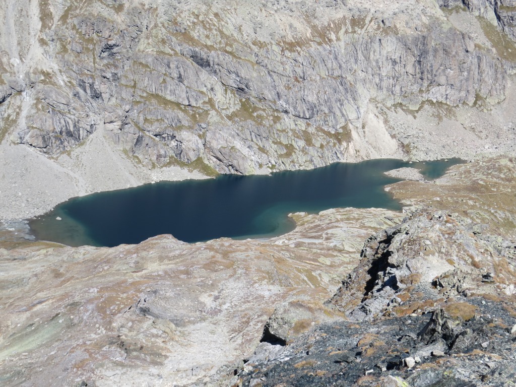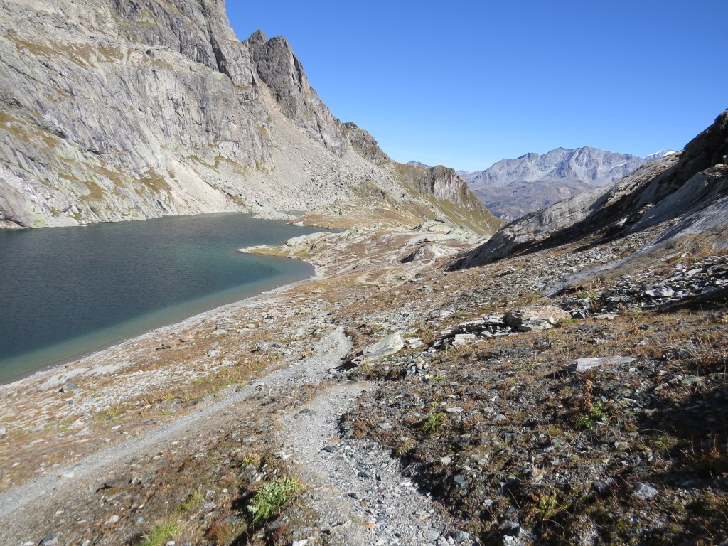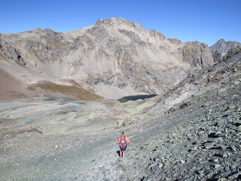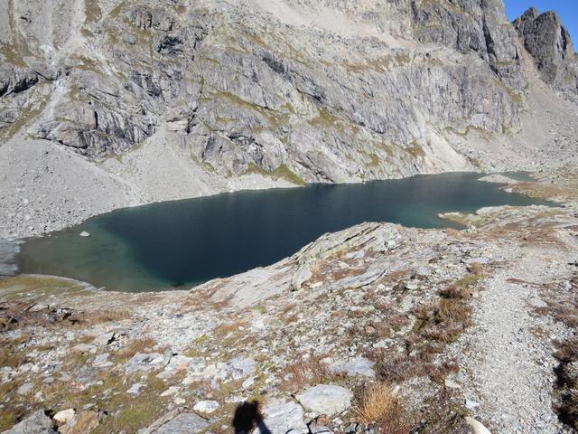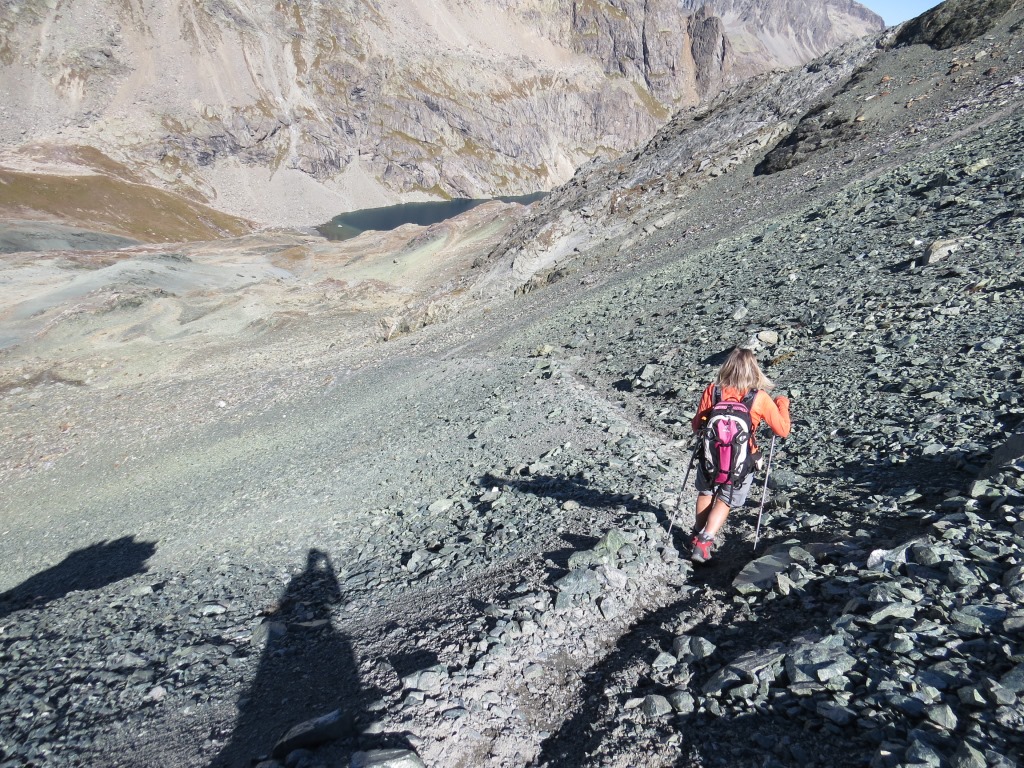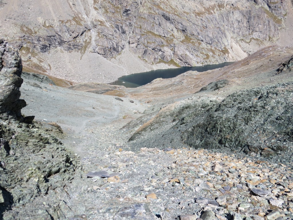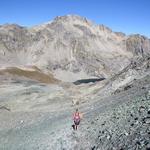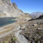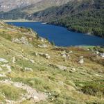 den Lägh dal Lunghin immer vor unseren Augen wandern wir über Schutt hinunter zum See