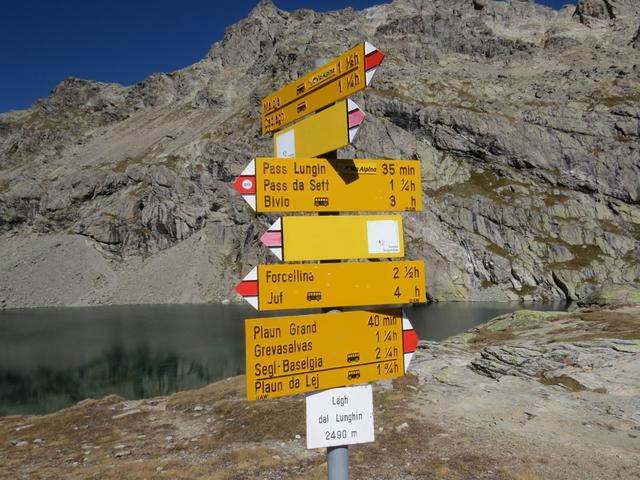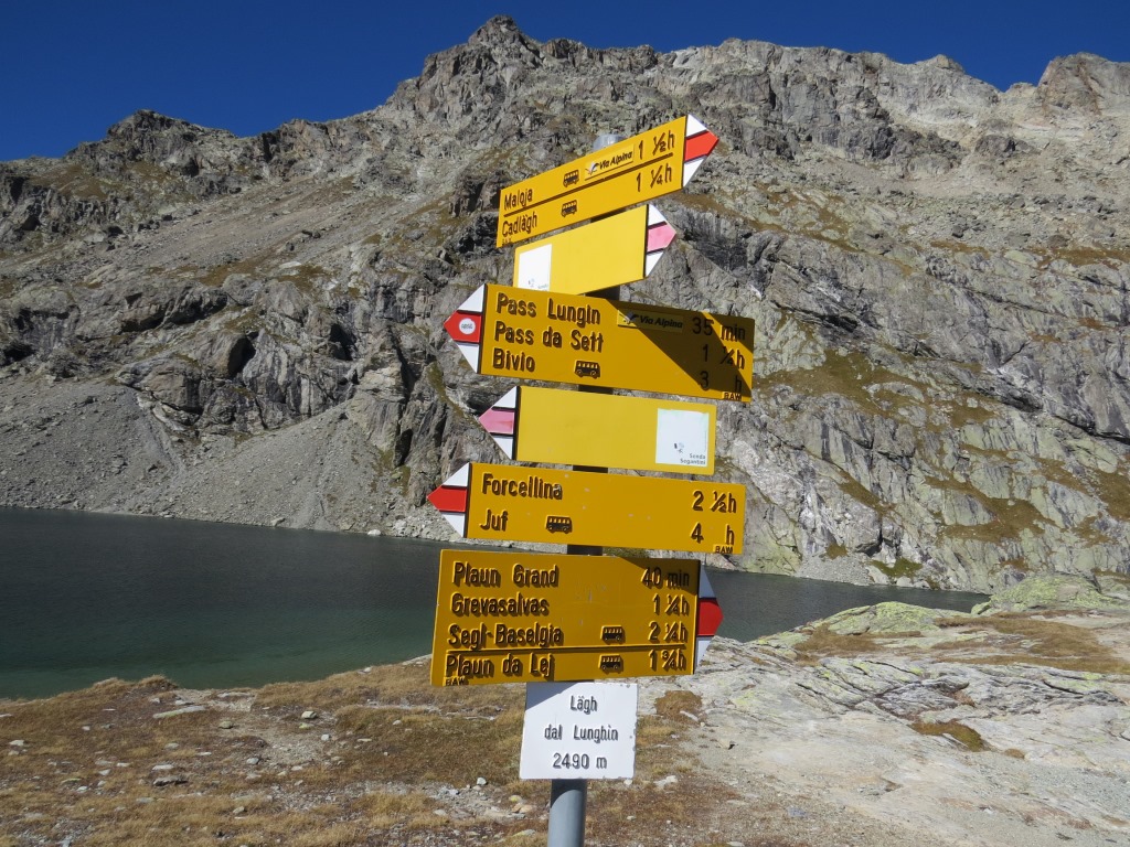 Wegweiser auf dem Pass Lunghin 2644 m.ü.M.