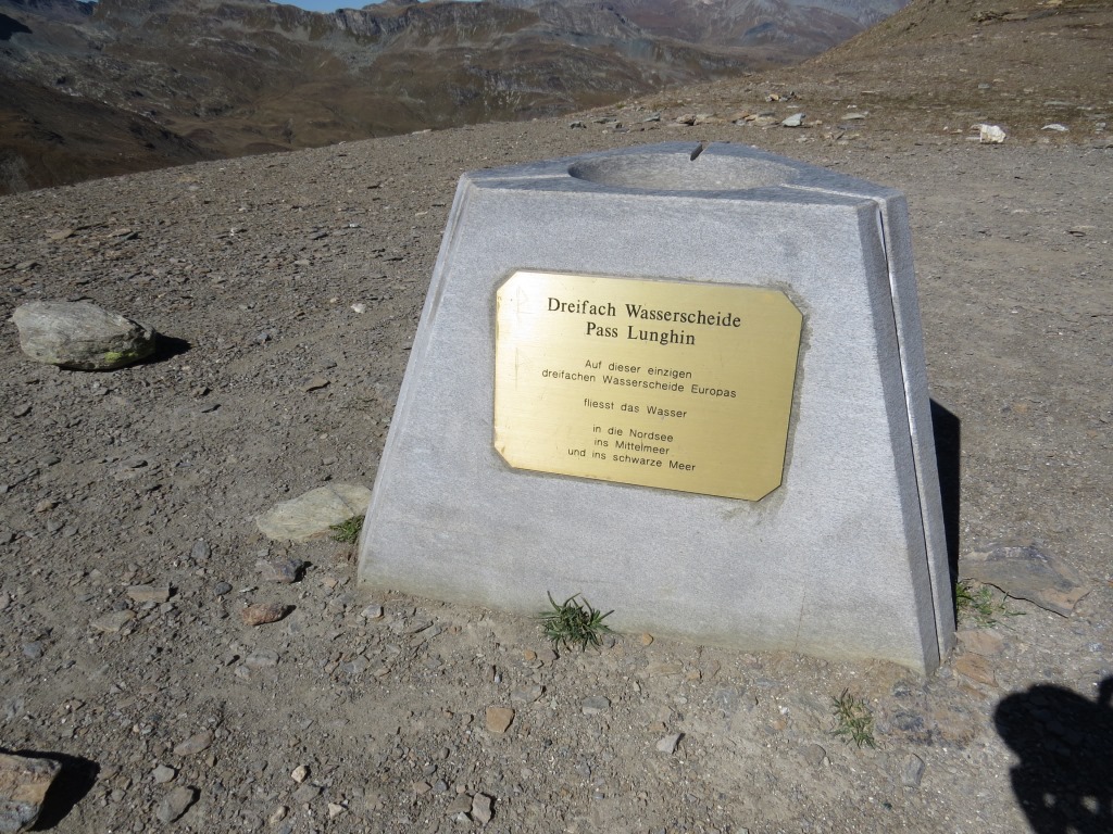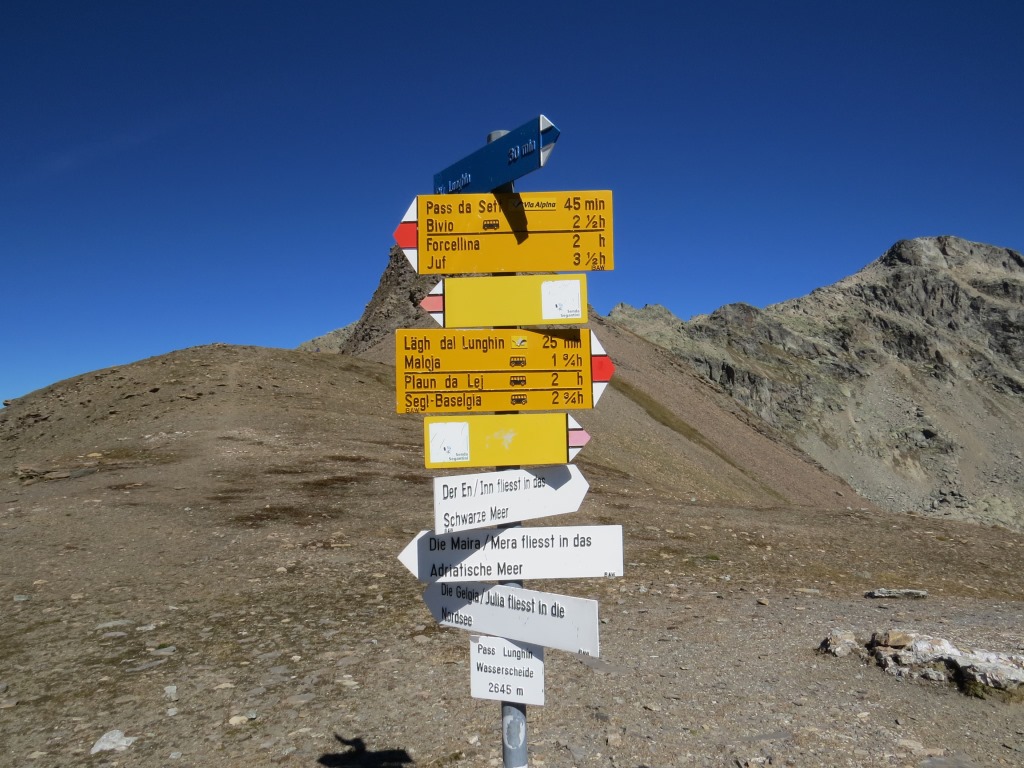 der Lunghinpass ist Europas einzige dreifache Wasserscheide. Die Julia - Nordsee, der Inn - Schwarzes Meer und die Maira - Adria