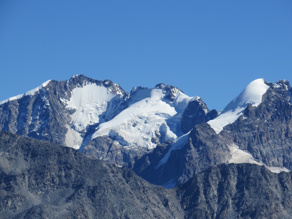 Piz Bernina mit Biancograt, Piz Scerscen und Piz Roseg herangezoomt