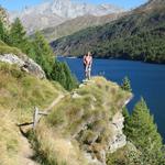 Blick zum Albigna Stausee. Sofort kommt uns die Wanderung zur Capanna da l'Albigna in den Sinn