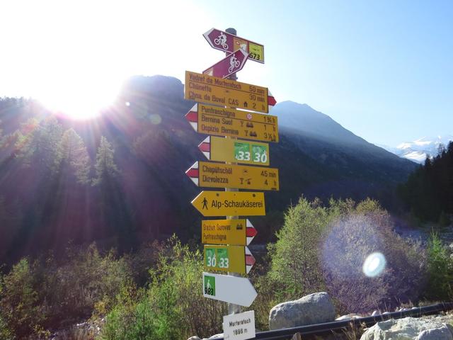 kurz danach stehen wir beim Wegweiser bei der Bahnstation Morteratsch 1896 m.ü.M. der Rhätischen Bahn Datum 02.02.2021