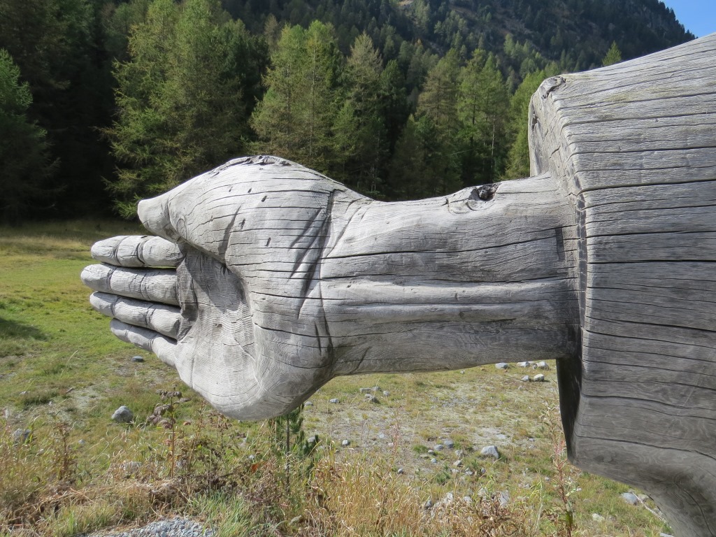 die riesige Hand zeigt uns die Richtung zum Bahnhof Morteratsch Datum 03.02.2021