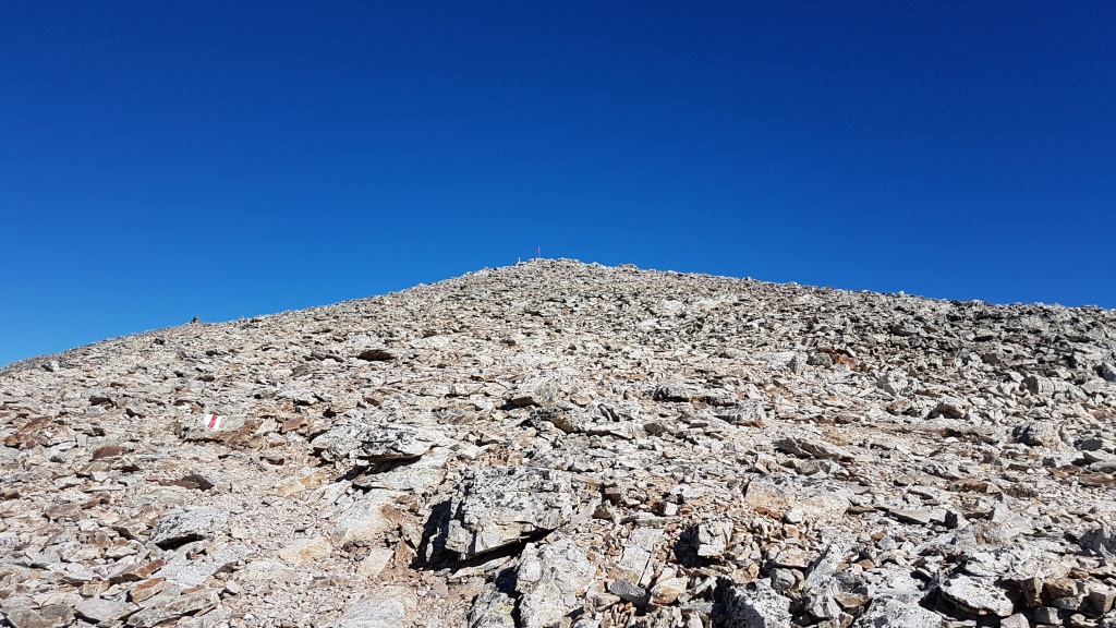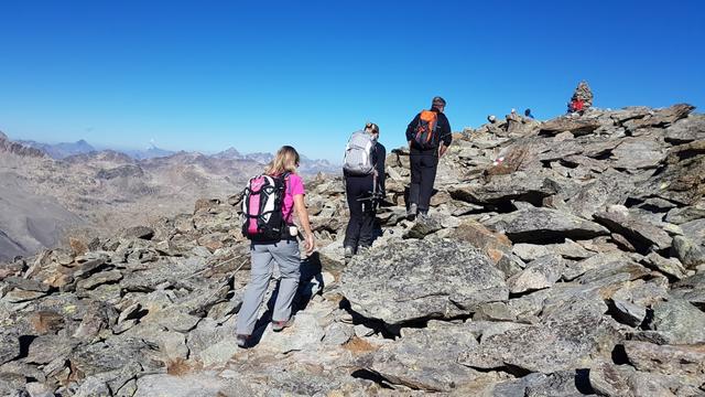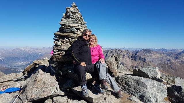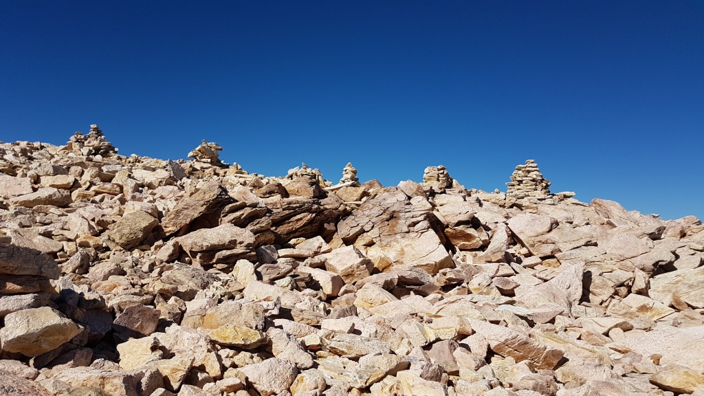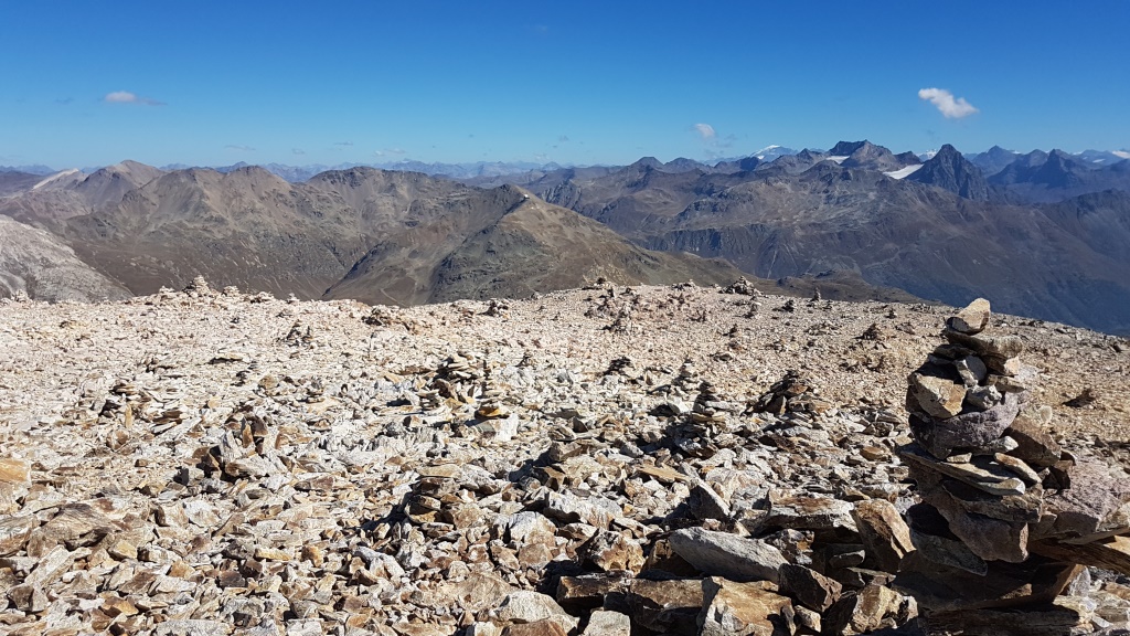 wir erreichen den Gipfel des Munt Pers 3206 m.ü.M. mit seinen vielen und grossen Steinmännern Datum 12.02.2021