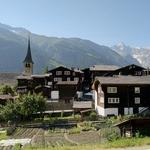 dicht gedrängt stehen die alten Walliser Holzhäuser am Wiesenhang