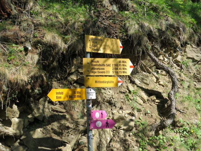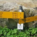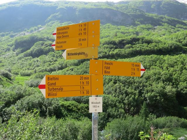 Wegweiser bei Freichi. Weiter geht es geradeaus Richtung Mittlenberghütte