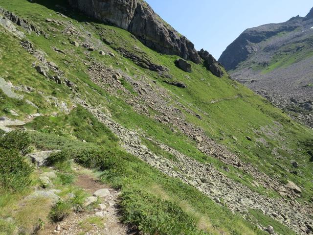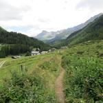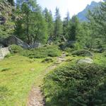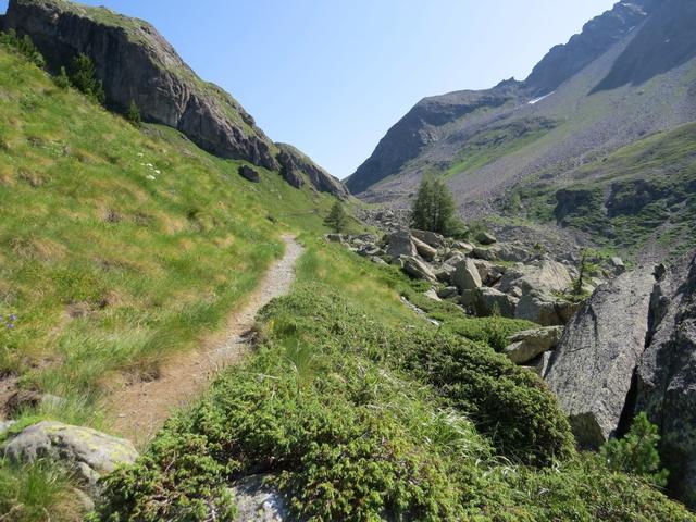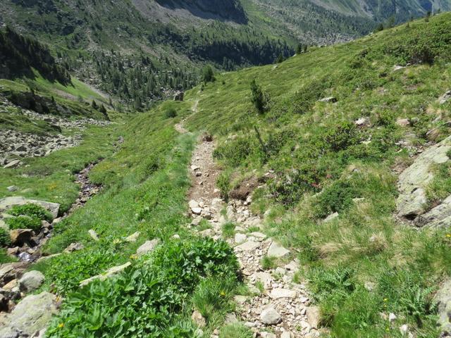 wir biegen aber rechts ab und laufen über einen Wanderweg auf der orographisch linken Talseite taleinwärts Datum 19.06.2023