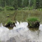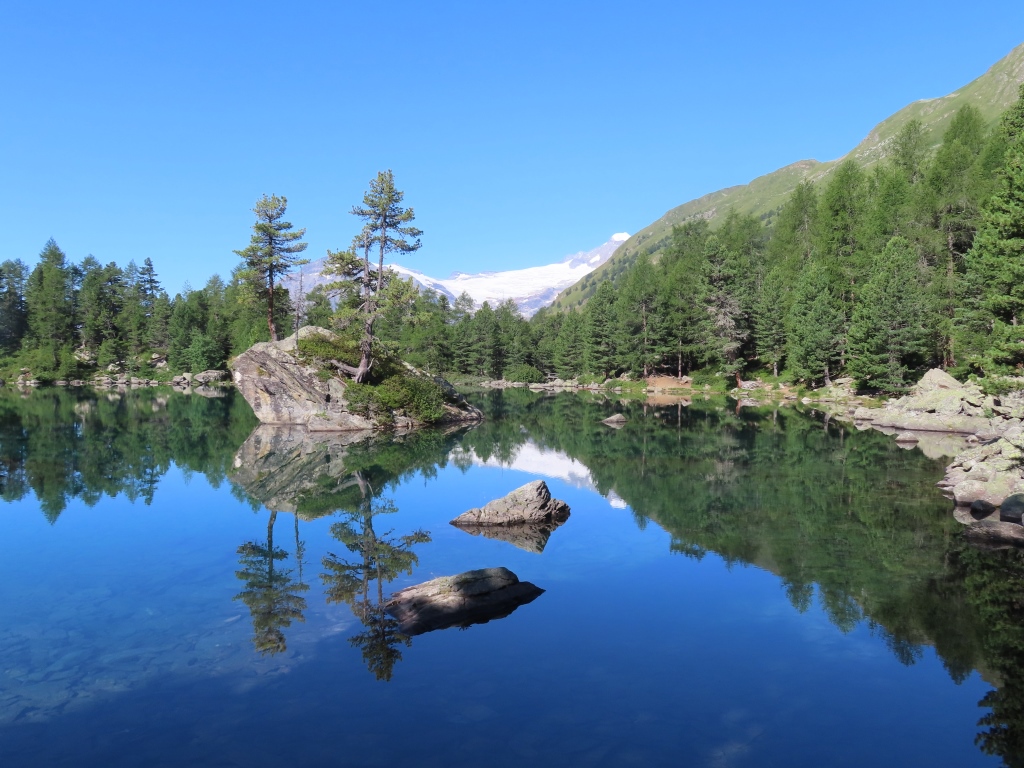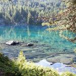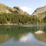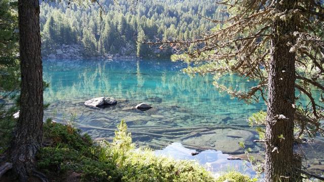 der Saoseo-See liegt spiegelglatt im lichten Wald Datum 04.08.2023