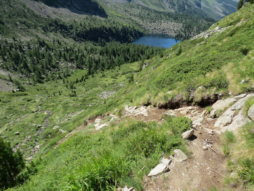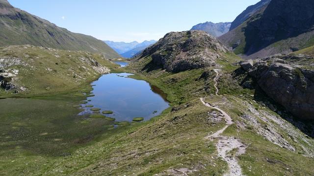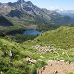 tief unter uns der Lagh da Dügüral, an dem wir beim Aufstieg vorbei gelaufen sind Datum 04.08.2023