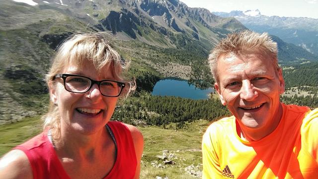 Erinnerungsfoto im Hintergrund der Lagh da Val Viola Datum 04.08.2023