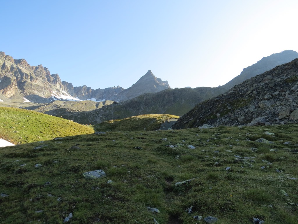 von der Weggabelung blicken wir in den Talboden hinunter und zur Chamonna Tuoi