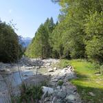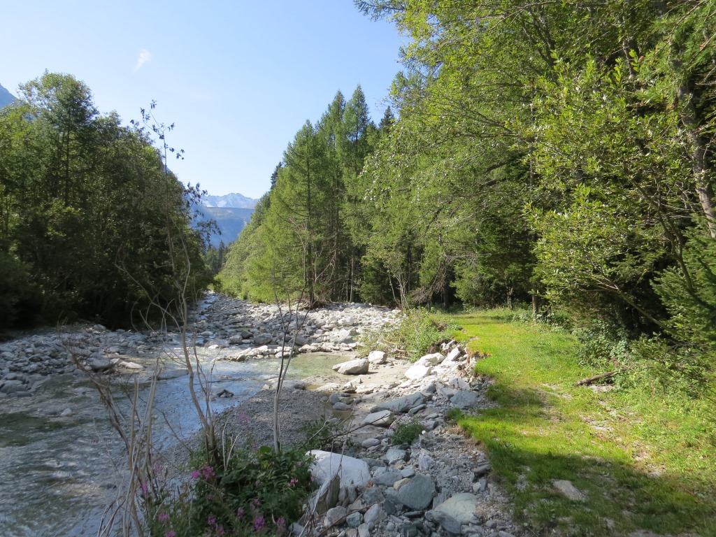 der breite Weg führt, flankiert von Erlengebüsch, an der Maira entlang
