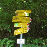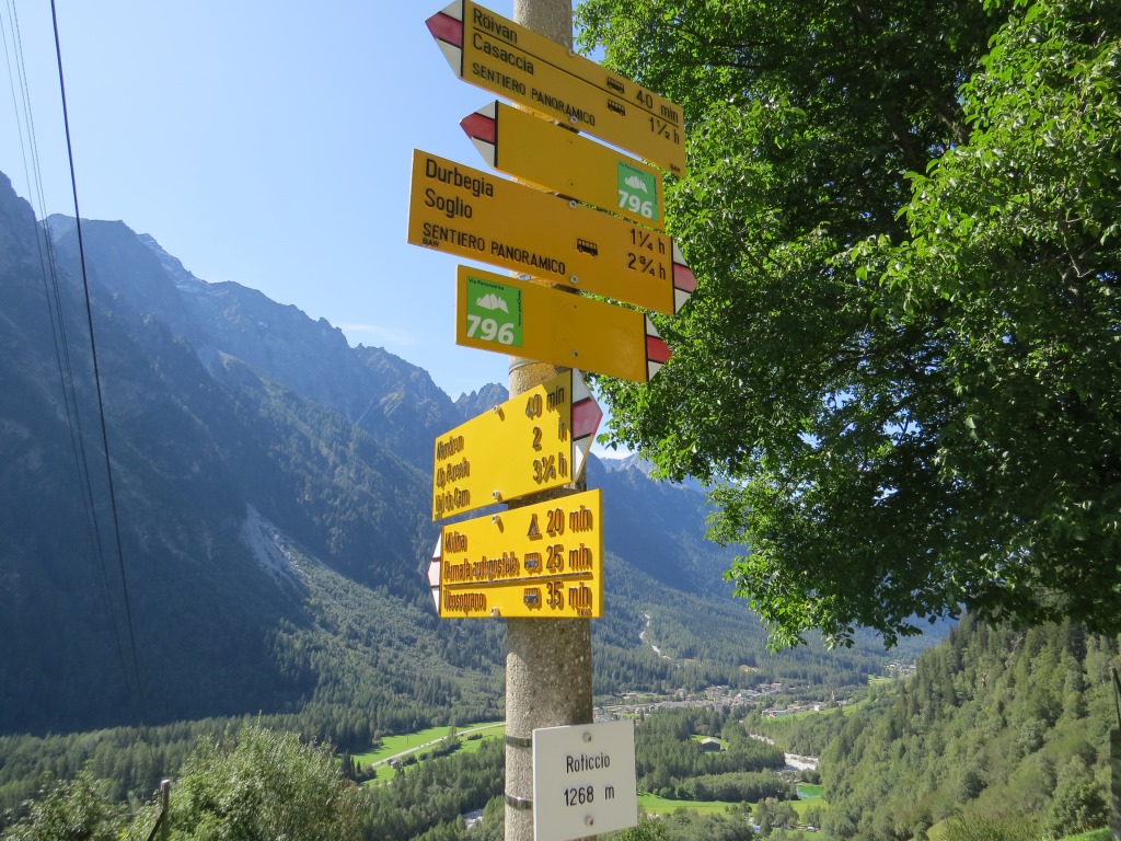 Wegweiser bei Roticcio. Bis Soglio folgen wir immer der Ausschilderung bzw. den Wegweiser nach Soglio