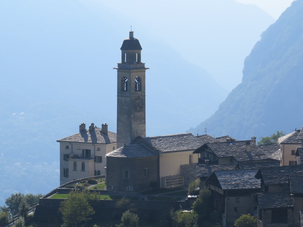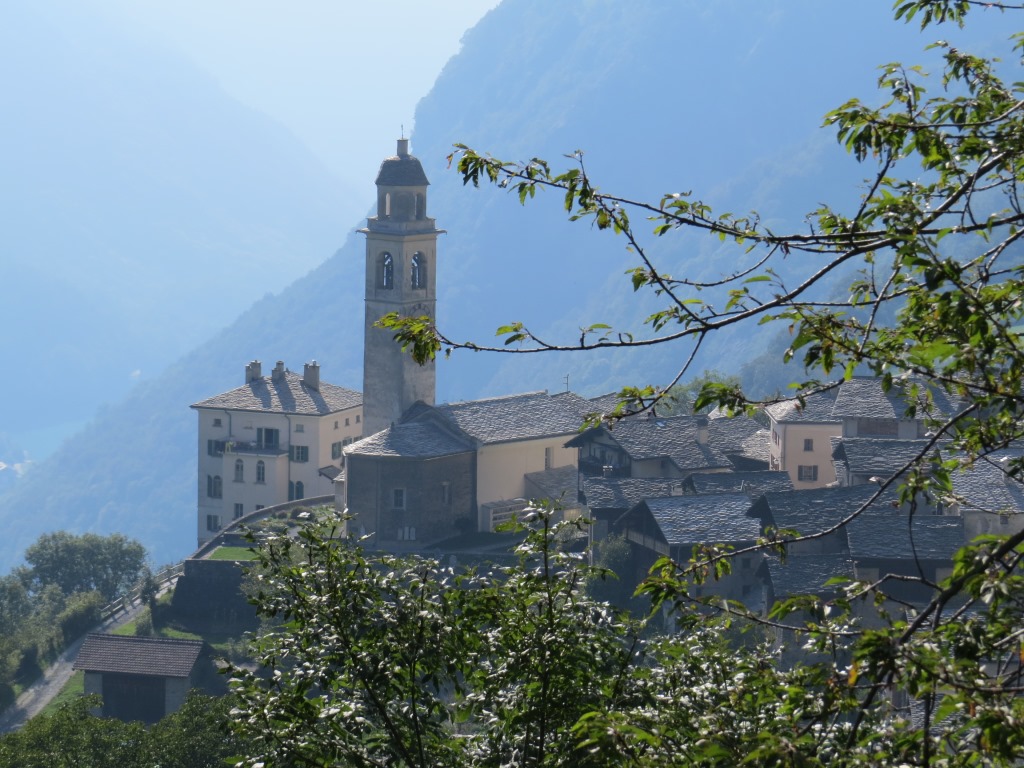hervorragender Ausblick auf das unten im Tal gelegene Vicosoprano mit seinem sehenswerten geschlossenen Ortskern