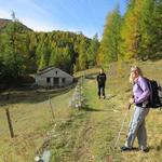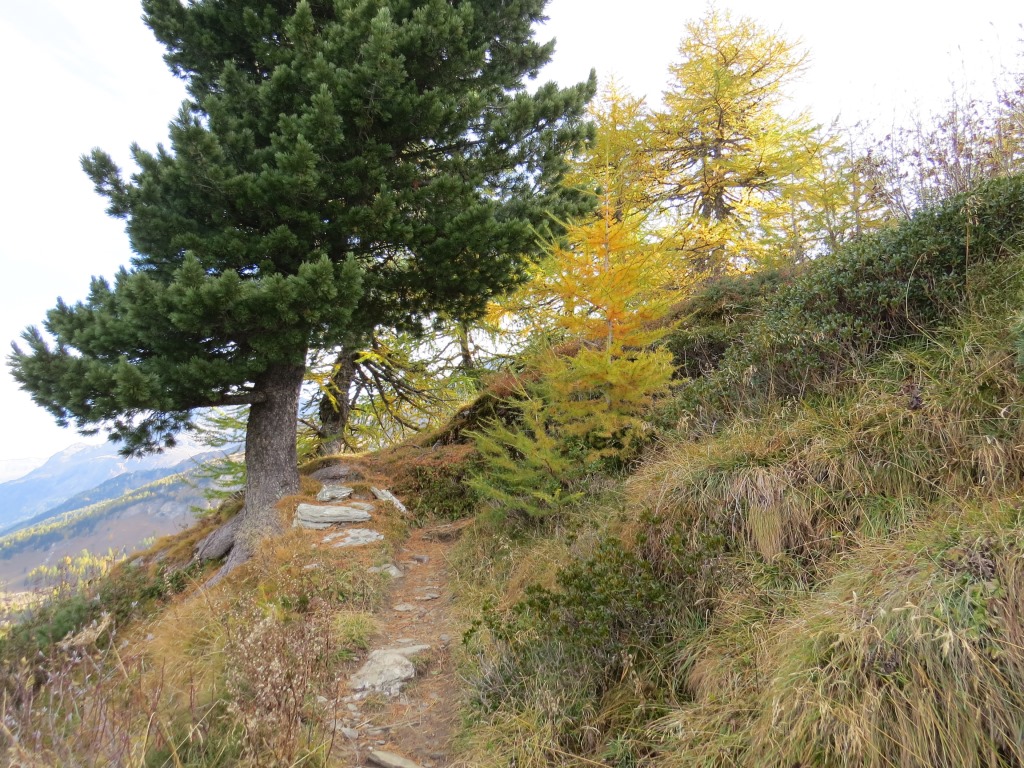dann in recht steilem Zickzack durch Alpenrosen, hinunter zu den Gebäuden der Alp da Segl Datum 30.10.2025