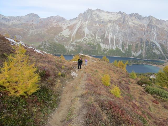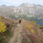 der Weg steigt leicht im lichten Wald an, erst oberhalb des Silsersees... Datum 27.10.2025